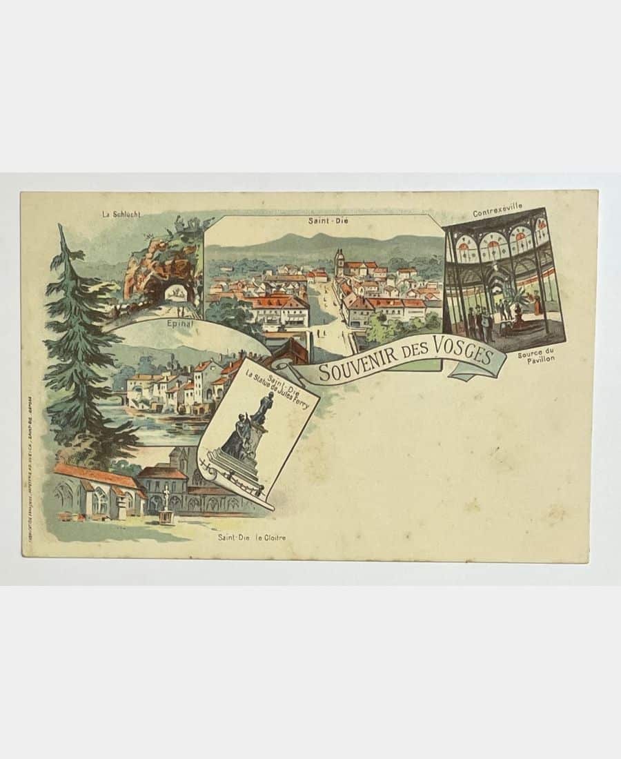 Souvenir des Vosges. La Schlucht. Saint-Dié. Contrexeville, Pavillon spring. Epinal. Saint-Dié, the statue of Jules Ferry, the cloister. Antique postcard published by Adolphe Weick, Saint-Dié. Circa 1900.