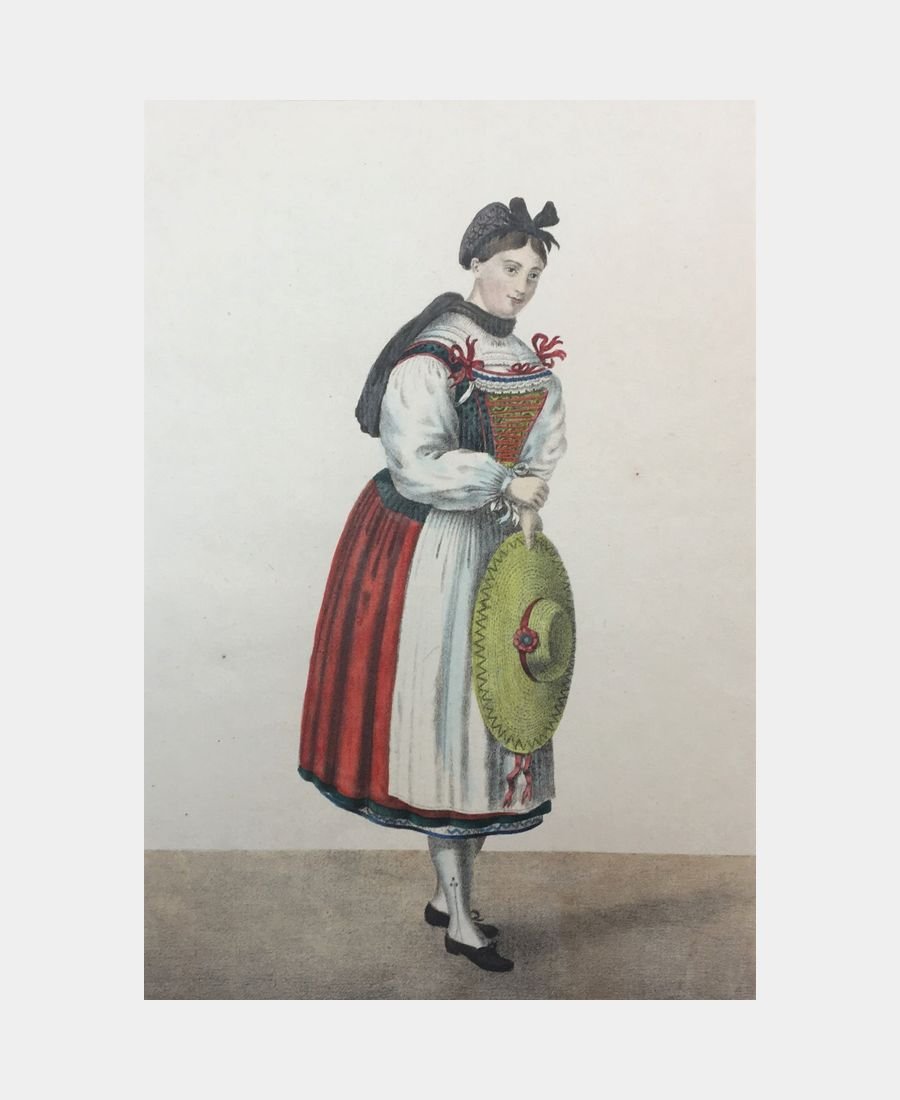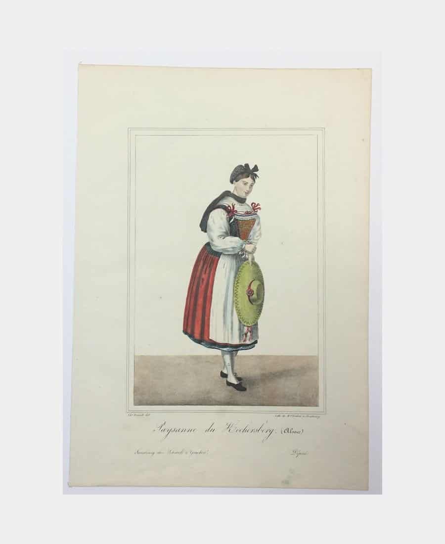 Paysanne du Kochersberg (Alsace). Lithographie de Boehm d’après Charles Emerich. Vers 1830, à Strasbourg. Coloris d’époque. Epreuve sur papier vergé. Dimension du feuillet : 365 x 257 mm. Dimension du sujet : 235 x 160 mm. Belle épreuve.