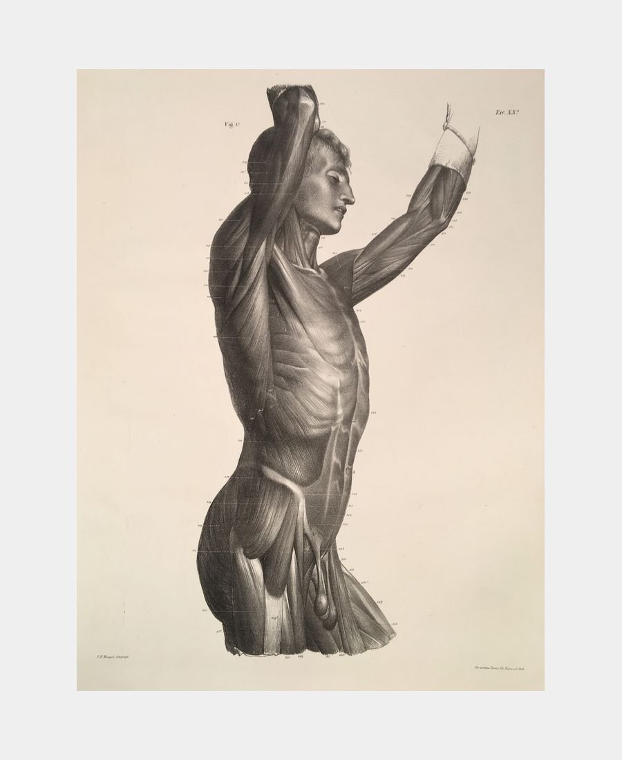 Ecorché. Lithographie originale de Paolo Emilio Morgari. 1838. Dimension de la feuille : 570 x 425 mm. Dimension du sujet : 450 x 220 mm. Légères traces marginales. Très belle épreuve de cet artiste peintre et lithographe turinois (Turin, 1815 – Turin, 1882).