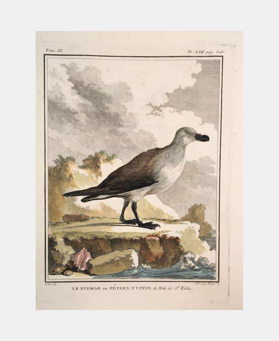 Le Fulmar ou petrel-puffin, de l’Isle de St-Kilda. BUFFON (Georges-Louis Leclerc, comte de). Gravure sur cuivre. XVIIIe siècle. Coloris main. Dimension du feuillet : 249 x 180 mm. Dimension au coup de planche : 220 x 174 mm. Planche XXII issue de l’Histoire naturelle des oiseaux de Buffon.