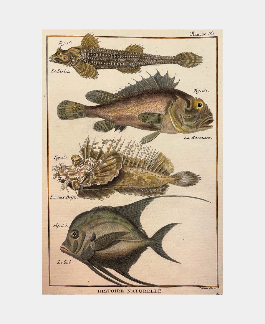 Histoire naturelle. Le Lisiza. La Rascasse. Diderot et d’Alembert. Gravure sur cuivre. XVIIIe siècle. Coloris main. Dimension du feuillet : 326 x 225 mm. Dimension au coup de planche : 254 x 194 mm. Planche 38 issue de l’Histoire naturelle de Diderot et d’Alembert.