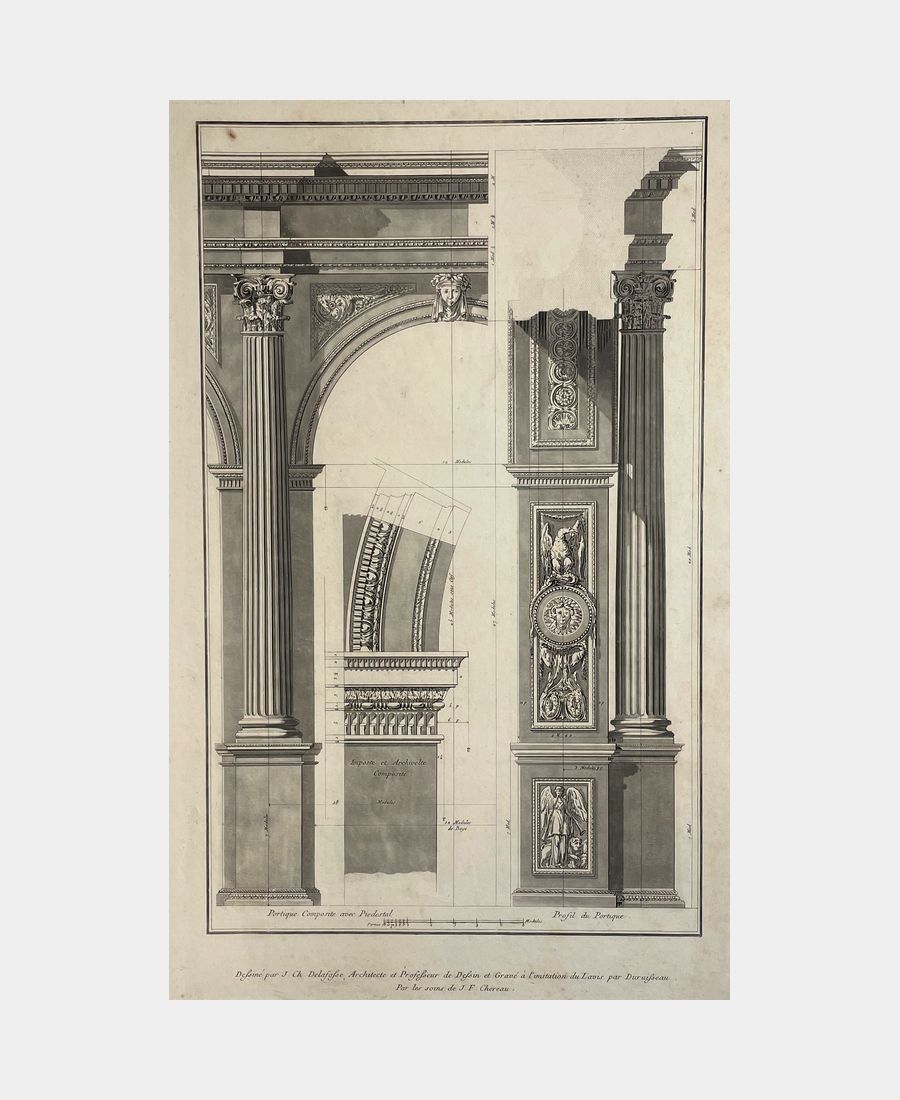 Portique Composite avec Piedestal. Profil du Portique. Dessiné par Jean-Charles Delafosse, architecte et professeur et gravé à l’imitation du lavis par L.-F. Duruisseau. Epreuve sur vergé, éditée à Paris chez Chereau. Gravure sur cuivre. 18ème siècle. Infimes rousseurs, une tâche d’oxydation sous le filet d’encadrement supérieur, très légères éraflures. Dimension du feuillet : 549 x 370 mm. Dimension au coup de planche : 520 x 354 mm.