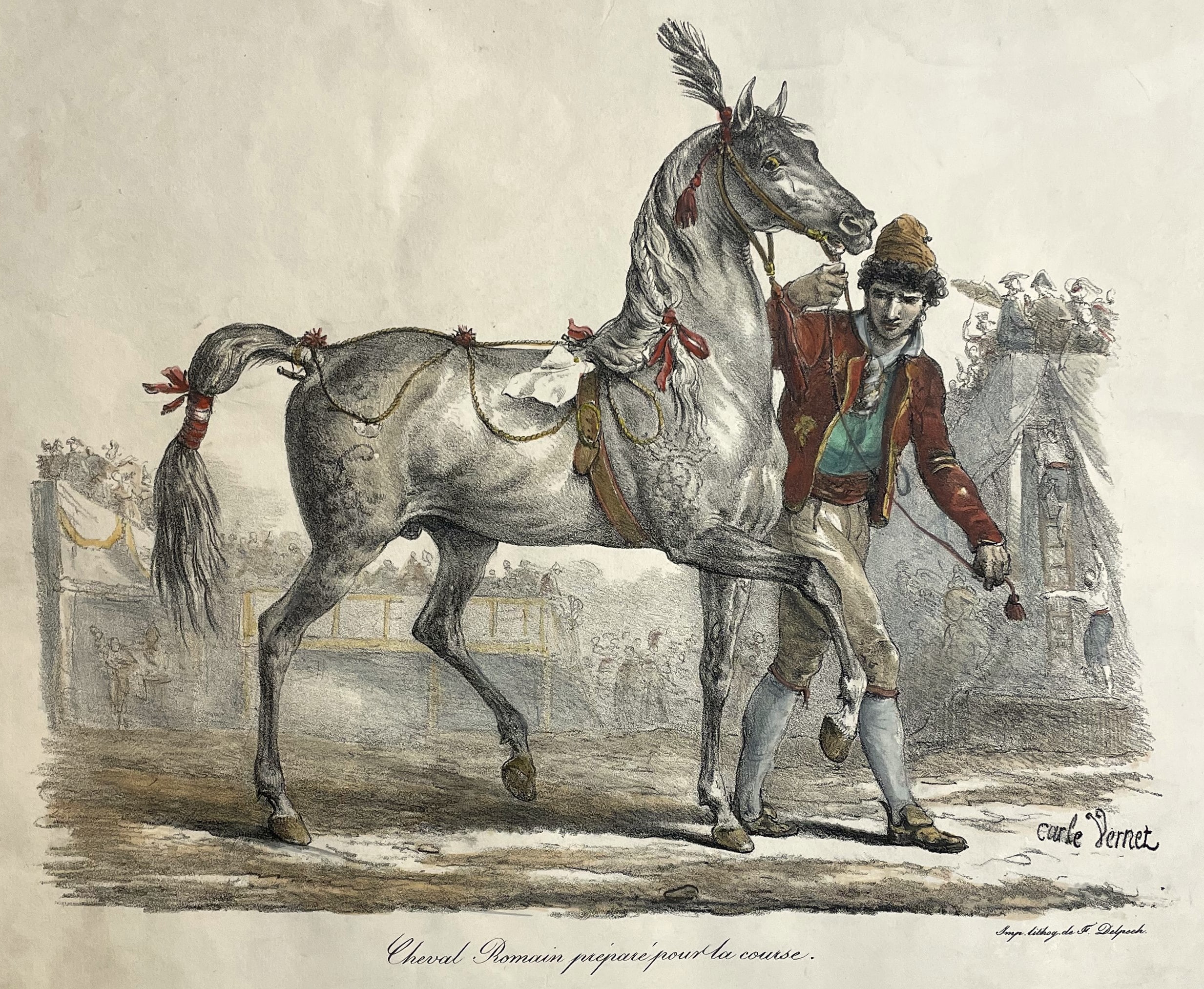 Cheval Romain préparé pour la course. Lithographie originale de Carle Vernet (1758, Bordeaux – 1836, Paris). Vers 1820. Imprimé chez François-Séraphin Delpech. Plis de manipulations, deux auréoles à droite du plumet et légères salissures, déchirure marginale sans incidence sur le motif. Dimension du feuillet : 383 x 470 mm. Dimension du sujet : 316 x 375 mm.