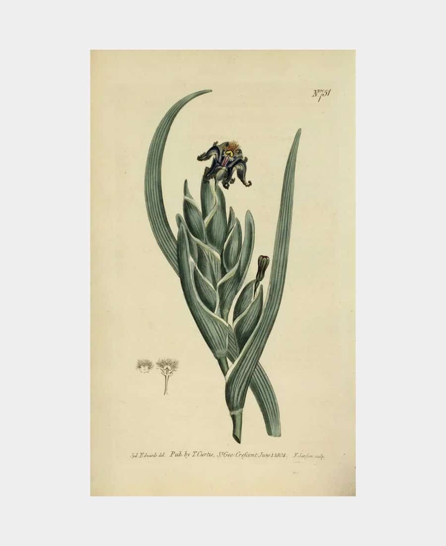 Ferraria Antherosa. Gravé par Francis Sansom d’après Sydenham Edwards. 1804. Eau-forte. Coloris main. Publié à Londres par T. Curtis pour The Botanical Magazine. Dimension du feuillet : 247 x 146 mm.