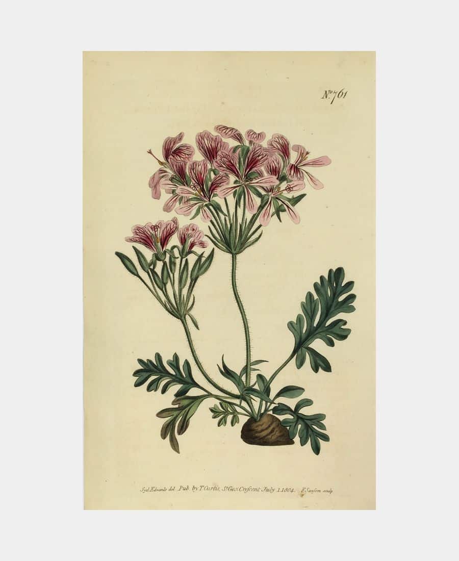 Pelargonium Incrassatum. Gravé par Francis Sansom d’après Sydenham Edwards. 1804. Eau-forte. Coloris main. Publié à Londres par T. Curtis pour The Botanical Magazine. Dimension du feuillet : 244 x 143 mm.