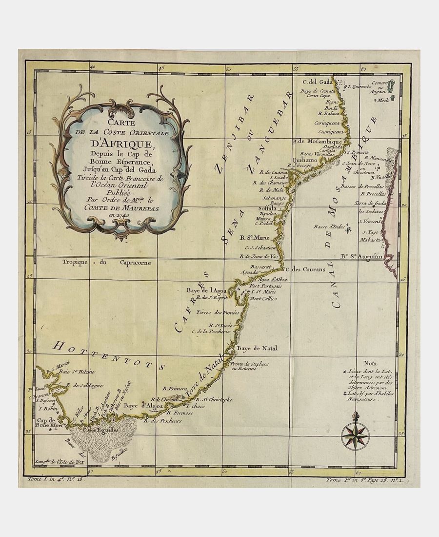 Carte de la Coste Orientale d’Afrique, Depuis le Cap de Bonne Esperance Jusqu’au Cap del Gada tirée de la Carte Francoise de l’Océan Oriental Publiée Par Ordre de Mgr. le Comte de Maurepas en 1740. Jacques-Nicolas Bellin (1703, Paris – 1772, Versailles) cartographe et hydrographe. XVIIIème siècle. Gravure sur cuivre. Coloris main. Infimes rousseurs, petite restauration marginale sans incidence sur le motif. Dimension du feuillet : 268 x 250 mm. Dimension au coup de planche : 255 x 235 mm. Issue de L’Histoire générale des voyages de l’Abbé Prévost.