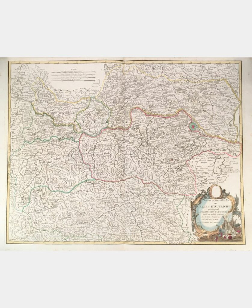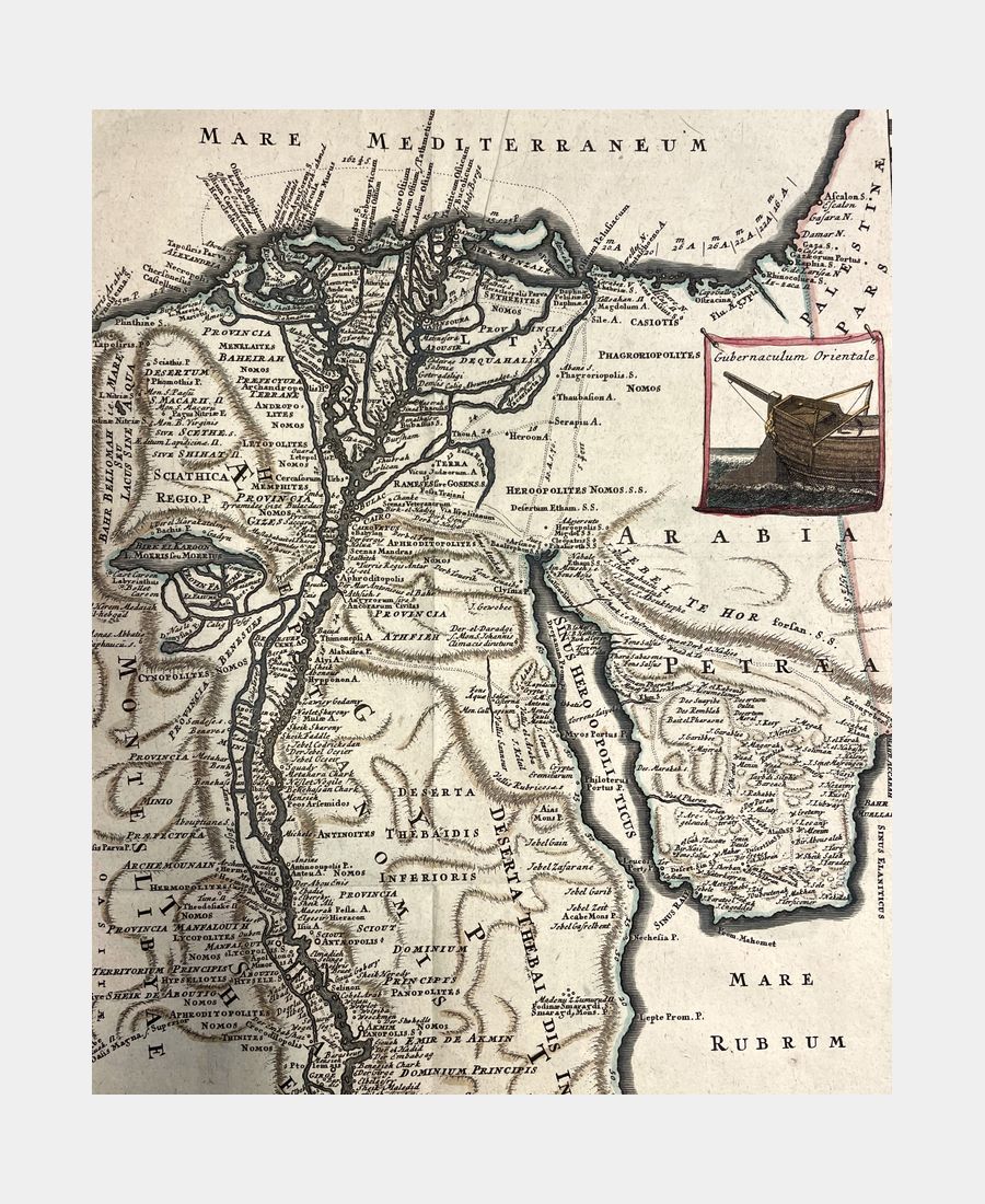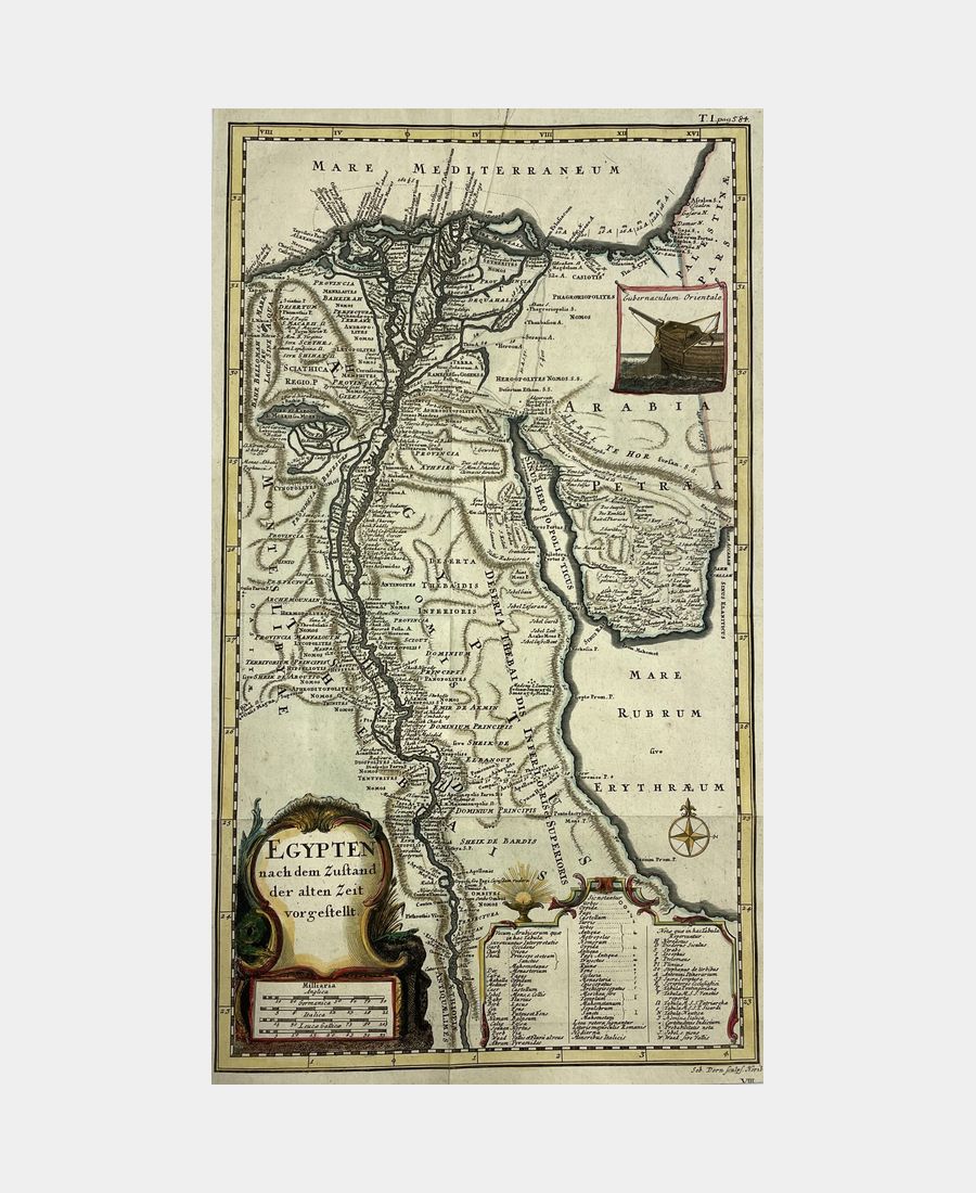 Egypten nach dem Zustand der alten Zeit vorgestellt. Gravure sur cuivre de S. Dorn. 1730. Coloris main. Plis horizontaux et verticaux. Marges courtes. Dimension du feuillet : 402 x 226 mm. Dimension du sujet : 382 x 216 mm. Carte géographique de l’Egypte antique avec les légendes en allemand et en latin.