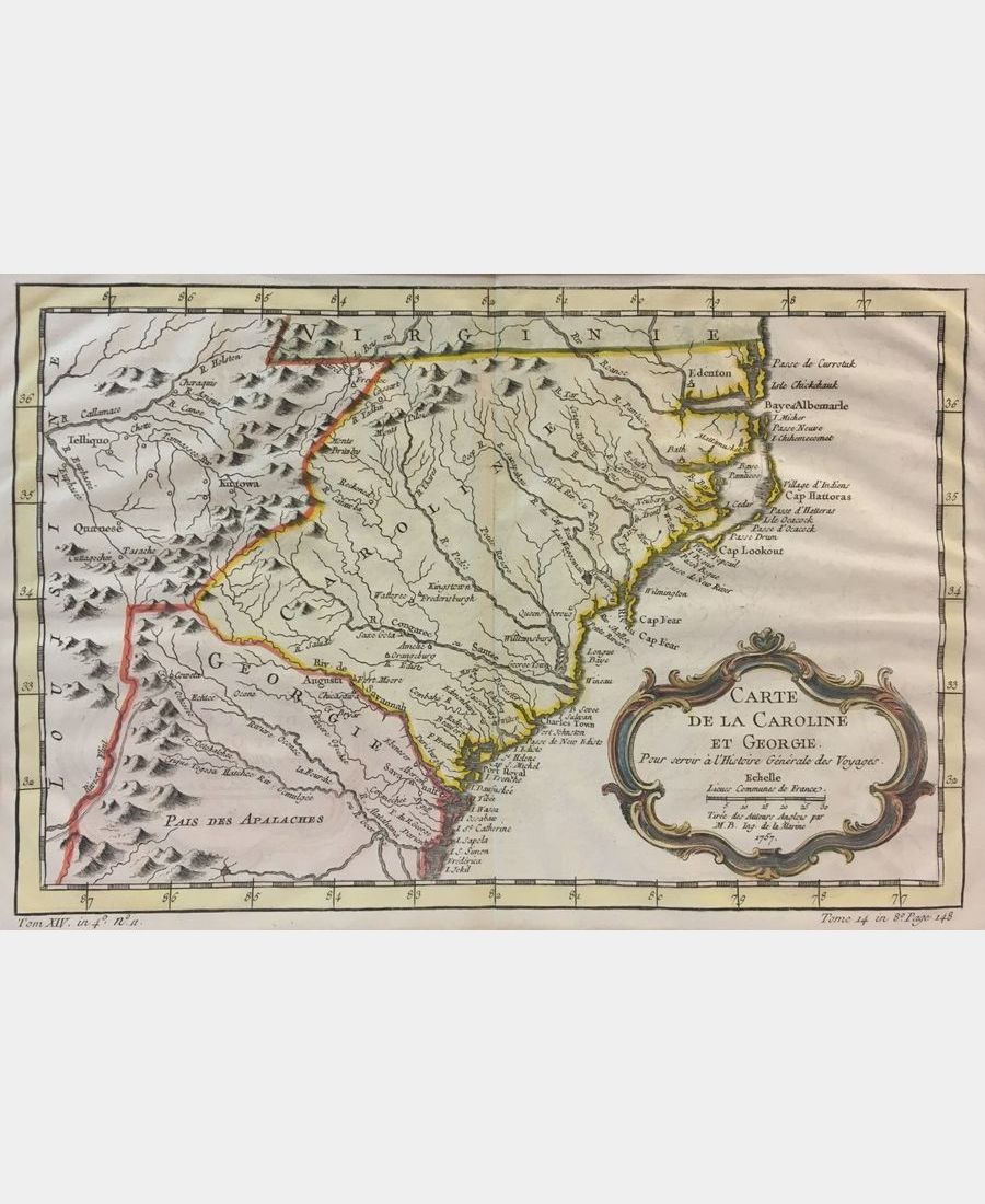 CARTE DE LA CAROLINE ET DE LA GEORGIE Jacques-Nicolas Bellin (1703, Paris – 1772, Versailles) 1757 Gravure sur cuivre Dimension du feuillet : 257 x 359 mm Dimension au coup de planche : 202 x 300 mm Coloris main. Bel état.