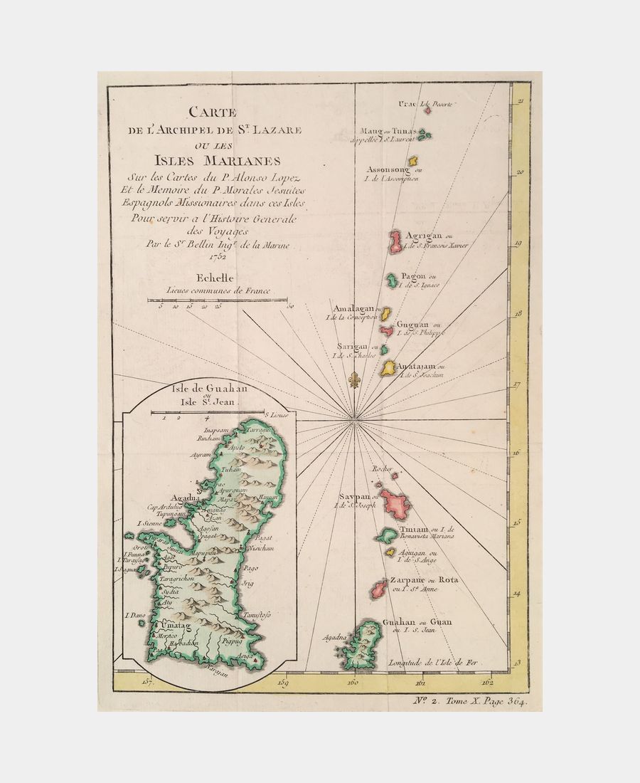 Carte de l’Archipel de Saint-Lazare ou les Isles Marianes sur les Cartes du P. Alonso Lopez Et le Memoire du P. Morales Jesuites Espagnols Missionnaires dans ces Isles. Jacques-Nicolas Bellin (1703, Paris – 1772, Versailles) cartographe et hydrographe. XVIIIe siècle. Gravure sur cuivre. Coloris main. Dimension du feuillet : 270 x 203 mm. Dimension au coup de planche : 235 x 167 mm. Bel état.