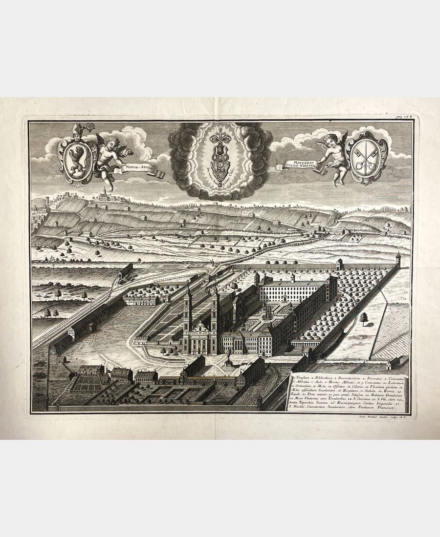 [Abbaye de Weissenau] Minor-Augia, Minderau vulgo Weissenau. Gravure sur cuivre de Johann Matthias Steidlin. 1734. Plis central et vertical, légère auréole centrale, indication à la plume de pagination. Dimension du feuillet : 460 x 625 mm. Dimension au coup de planche : 375 x 485 mm. Vue de l’ouest de l’abbaye de Weissenau dans le Bade-Wurtemberg, à Ratisbonne, légendée en latin. Belle grande épreuve sur papier vergé.