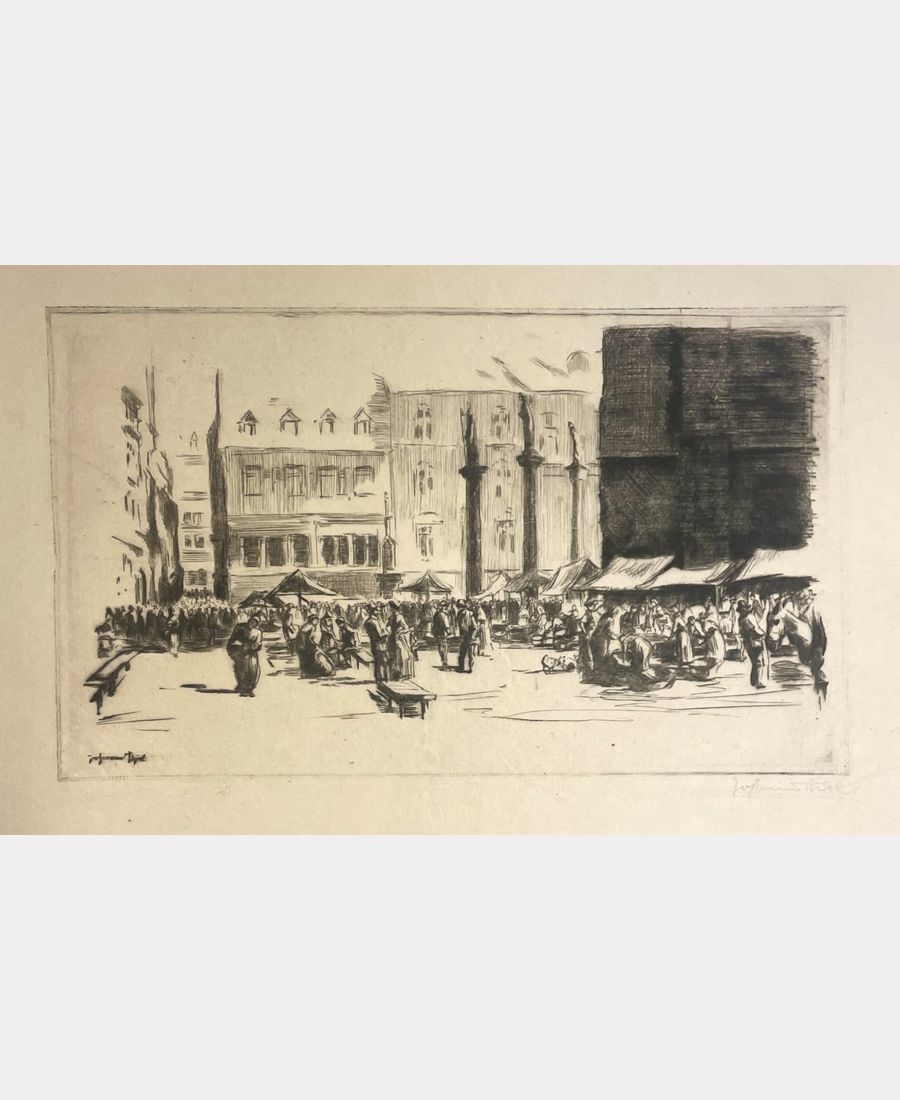 Place de la Cathédrale à Fribourg-en-Brisgau (Allemagne, Bade-Wurtemberg). Pointe sèche originale de Johannes Thiel (1889 – 1962) sur papier Japon. XXème siècle.