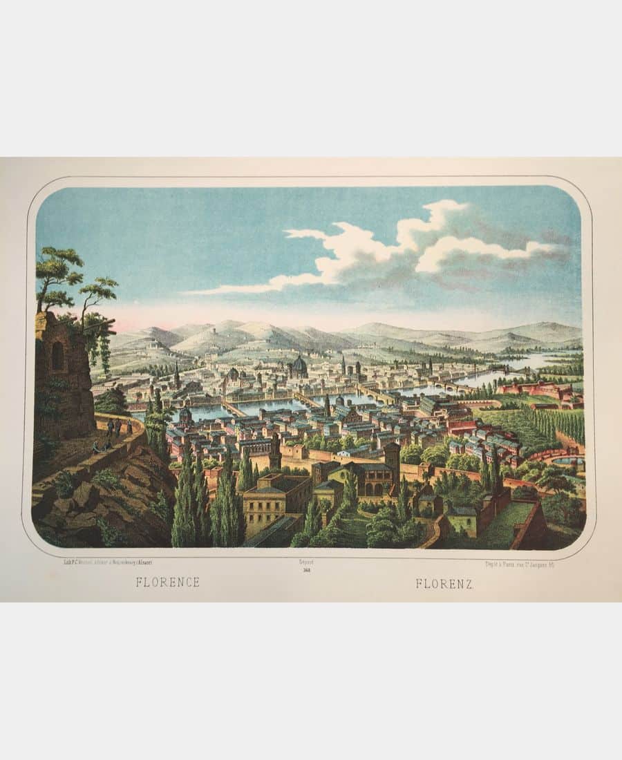 Florence. Lithographie imprimée chez Frédéric – Charles Wentzel à Wissembourg (avant 1877). Tirage en couleurs. Dimension du feuillet : 360 x 520 mm. Dimension du sujet : 249 x 376 mm. Très belle épreuve.