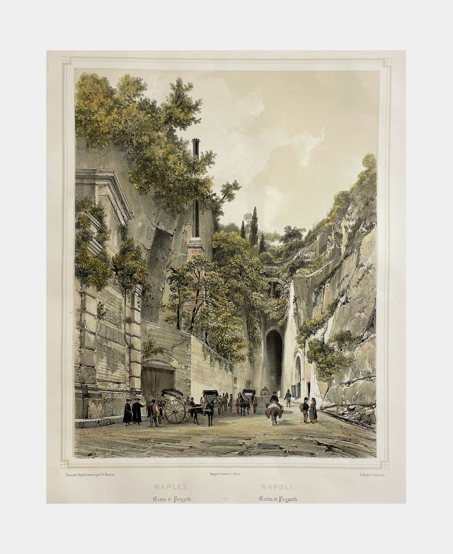 Naples – Grotte de Pouzzole. Lithographie de Louis-Julien Jacottet (1806 – 1880) d’après Philippe Benoist (1813 – c. 1905). Vers 1850. Coloris main. Très belle épreuve sur papier vélin éditée par Bulla et Delarue, Paris et imprimée par Lemercier, Paris, de la série « Italie monumentale et artistique ». Dimension du feuillet : 439 x 362 mm. Dimension du sujet : 276 x 216 mm.