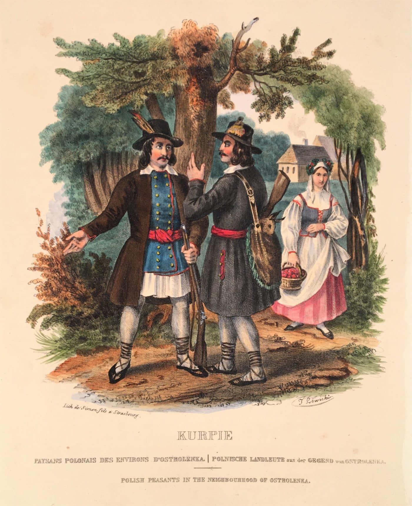 Paysans polonais des environs d’Ostrolenka. Lithographie imprimée à Strasbourg chez Frédéric Simon d’après Lewicki. 1841. Coloris anciens. Dimension du feuillet : 287 x 229 mm. Dimension du sujet : 195 x 175 mm. Lithographie peu courante ayant gardée toute la fraicheur des ses coloris anciens.