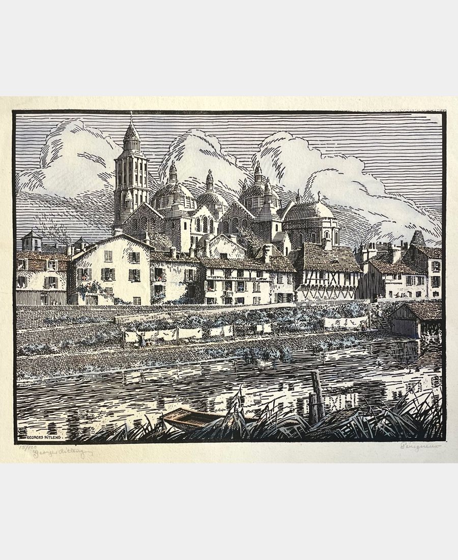 Périgueux. Georges Ritleng (1875, Strasbourg – 1972, Mont Sainte-Odile). Gravure sur bois, coloris main. Epreuve numérotée 15/100 et signée en bas à gauche, titrée en bas à droite. Dimension du feuillet : 440 x 405 mm. Dimension du sujet : 362 x 538 mm. Grande vue de Périgueux et de la cathédrale Saint-Front par l’artiste alsacien Georges Ritleng qui y séjourna suite à l’évacuation de Strasbourg en 1939.