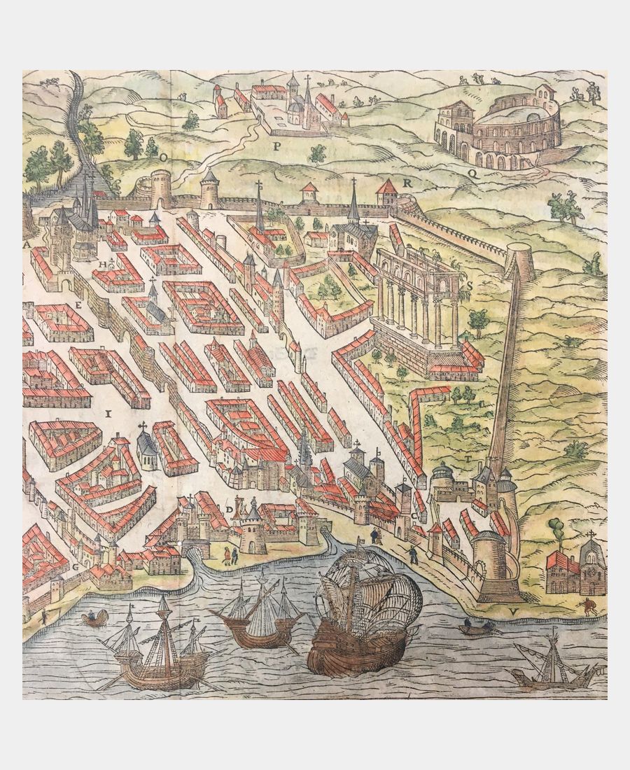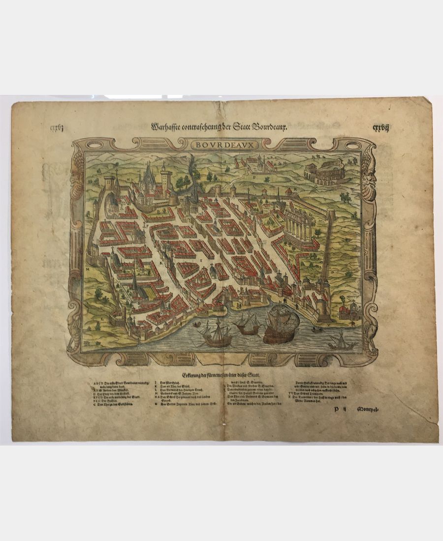 Bourdeaux. Gravure sur bois. Sebastian Munster. XVIe siècle. Coloris main. Dimension du feuillet : 330 x 408 mm ; Dimension du sujet : 221 x 297 mm. Un trou de vers dans la pliure centrale sinon bel exemplaire. Carte issue de la Cosmographie de Sebastian Munster.
