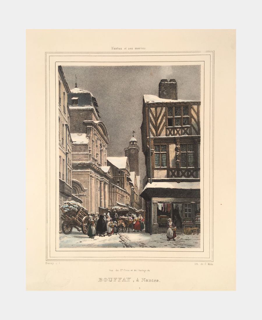 Vue de Sainte Croix et de l’horloge du Bouffay, à Nantes. Lithographie de Motte d’après Deroy. 19ème siècle. Coloris main. Dimension du feuillet : 310 x 233 mm. Dimension du sujet : 163 x 127 mm. Petite rousseur de 3mm dans le ciel. Belle épreuve.