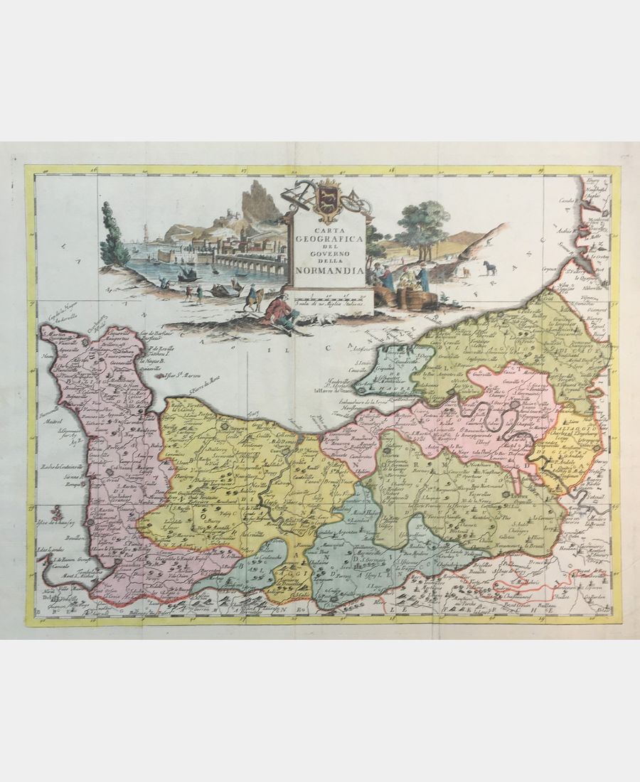 Carta geografica del governo della Normandia. Guillaume de L’Isle. Gravure sur cuivre. Imprimé à Venise en 1750. Coloris main. Dimension du feuillet : 365 x 490 mm. Dimension au coup de planche : 340 x 440 mm. Légères marques de plis.