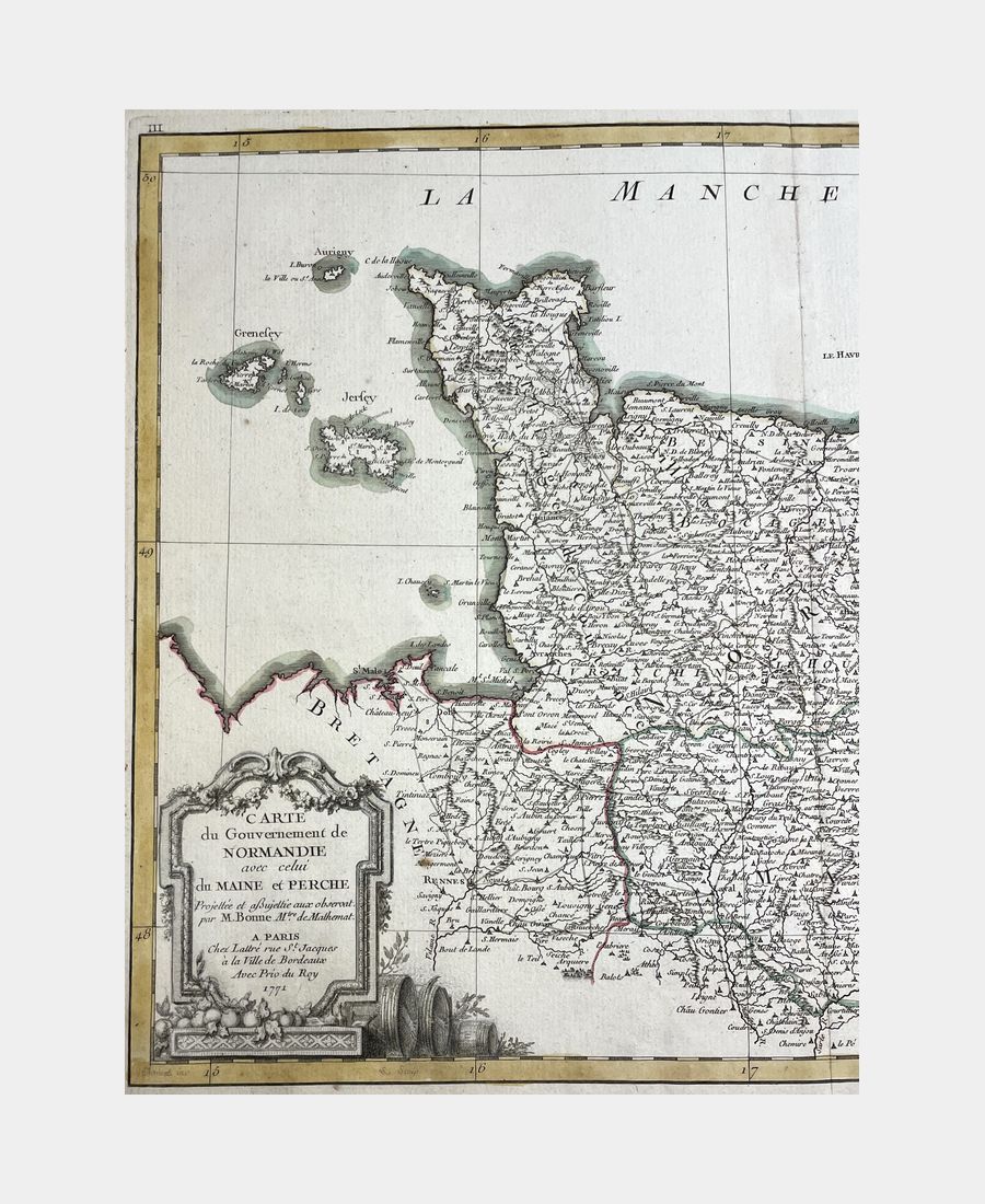 Carte du Gouvernement de Normandie avec celui du Maine et Perche. Rigobert Bonne. 18ème siècle.