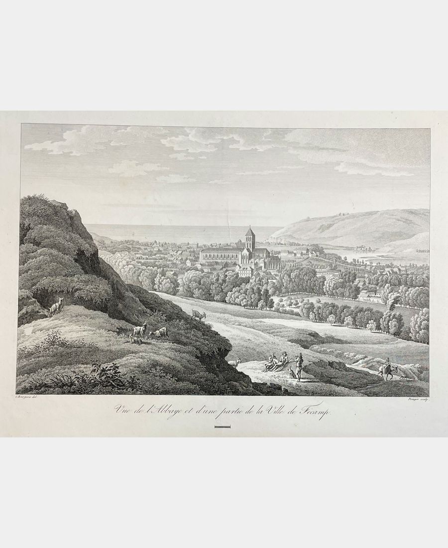 Vue de l’Abbaye et d’une partie de la Ville de Fécamp. Gravure de Benedikt Piringer (1780, Vienne – 1826, Paris) d’après C. Bourgeois. Début XIXe siècle. Eau-forte. Très légers plis. Dimension du feuillet : 404 x 558 mm. Dimension au coup de planche : 354 x 455 mm. Belle vue de Fécamp avec une scène champêtre en premier plan.