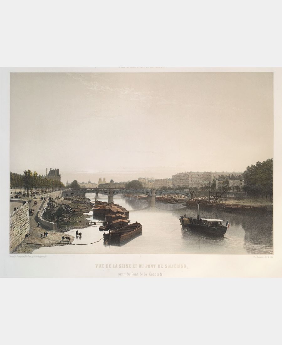 Vue de la Seine et du pont de Solférino prise du Pont de la Concorde. Lithographie originale de Philippe Benoist. 1861. Coloris main. Epreuve éditée par Charpentier, Nantes et Paris de la série Paris dans sa splendeur. Dimension du feuillet : 332 x 485 mm. Dimension du sujet : 248 x 360 mm. Belle épreuve.