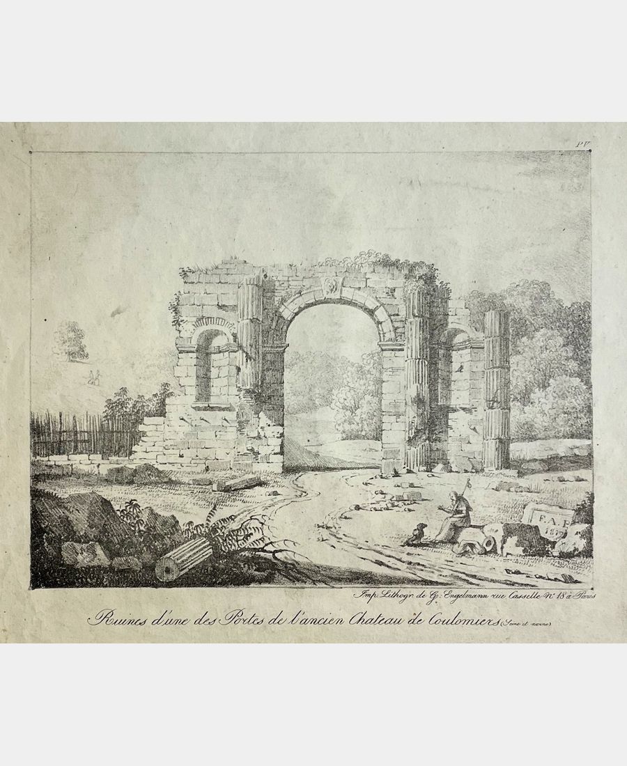 Ruines d’une des Portes de l’ancien Château de Coulomiers (Seine et Marne). Lithographie de François-Alexandre Pernot. 1817. Imprimé chez Godefroy Engelmann à Paris. Plis de manipulation, légères salissures. Dimension du feuillet : 230 x 300 mm. Dimension du sujet : 149 x 190 mm. Post-incunable de la lithographie.