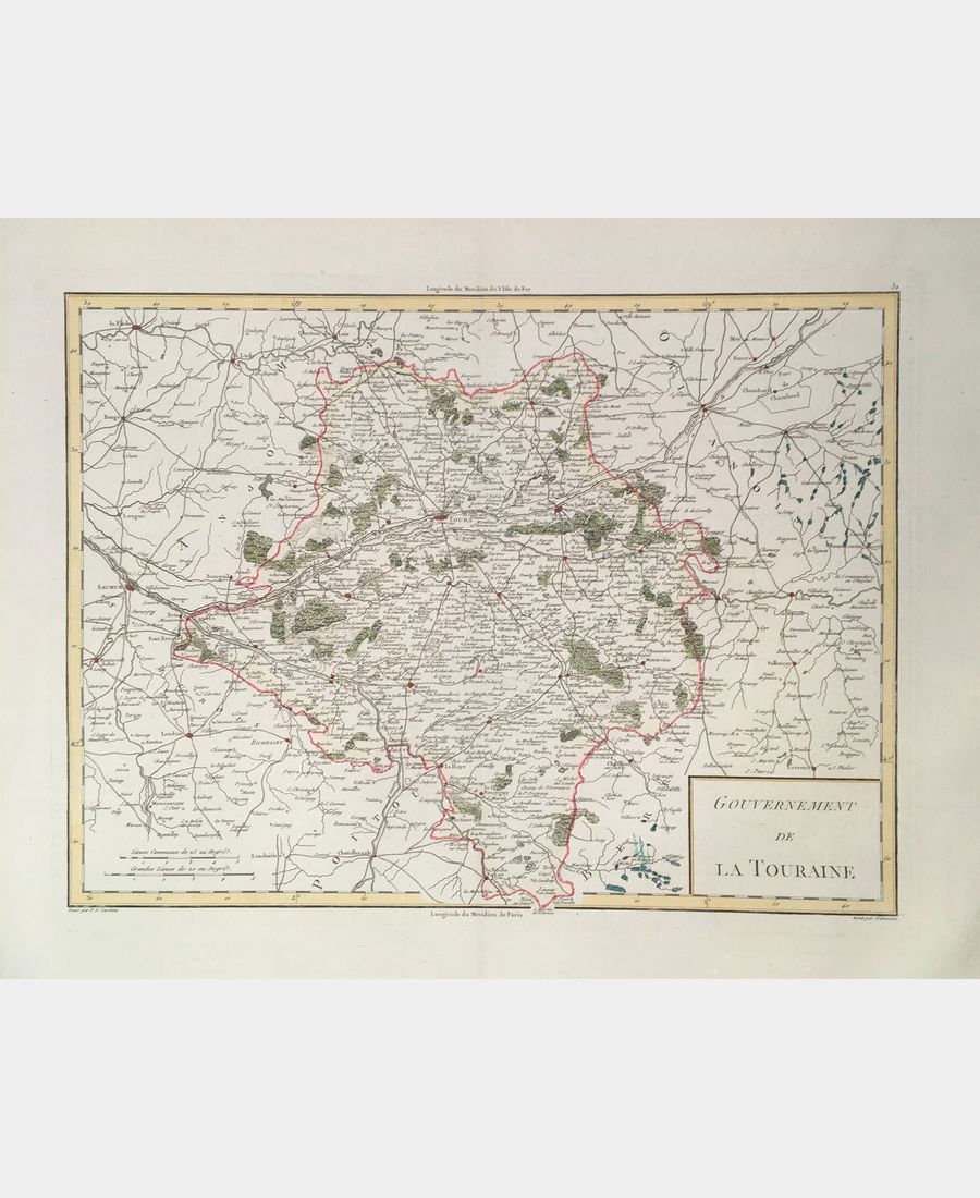 Gouvernement de la Touraine. Gravure sur cuivre. 1798. Gravé par P. F. Tardieu, écrit par Herault. Coloris main. Dimension du feuillet : 420 x 561 mm. Dimension au coup de planche : 340 x 450 mm. Pliure centrale. Très belle épreuve.
