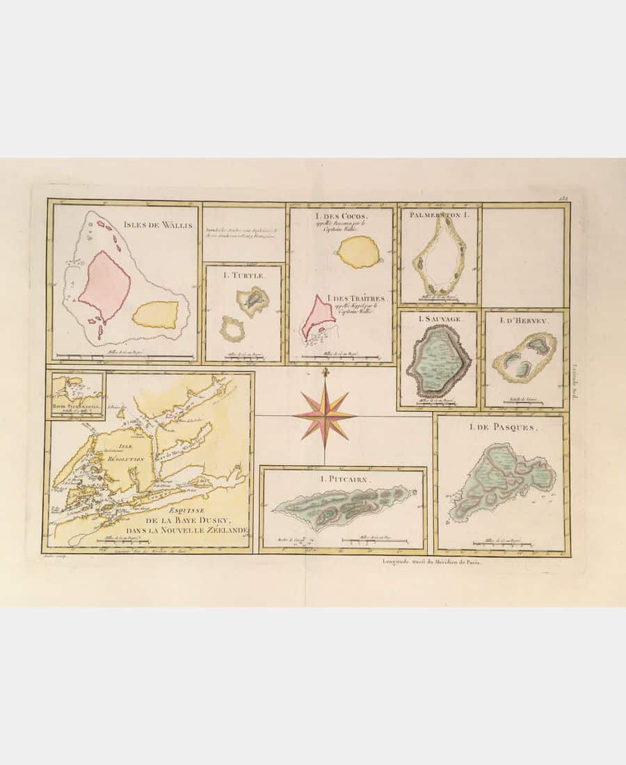 Isles de Wallis. I. Turtle. I. des Cocos, I. des Traîtres. Palmerston I. I. Sauvage. I. d’Hervey. Esquisse de la Baye Dusky dans la Nouvelle Zéelande. I. Pitcairn. I. de Pasques. Rigobert Bonne. Gravure sur cuivre. XVIIIe siècle. Coloris main. Dimension du feuillet : 315 x 466 mm. Dimension au coup de planche : 251 x 364 mm. Pli central. Très bon état.
