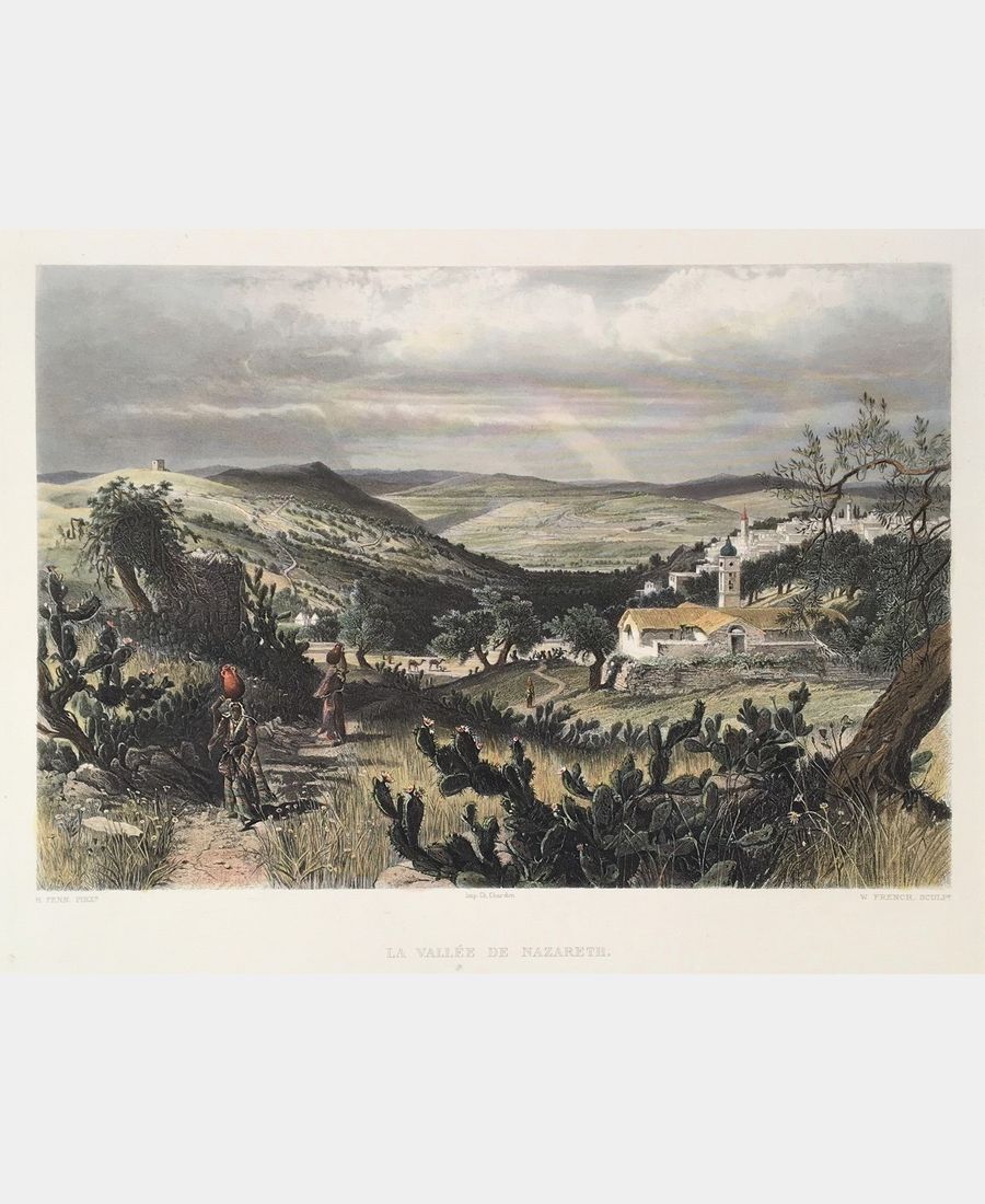 La Vallée de Nazareth. Eau-forte de W. French d’après Harry Fenn. 1882. Coloris main. Dimension du feuillet : 272 x 388 mm. Dimension au coup de planche : 244 x 313 mm. Très bon état.