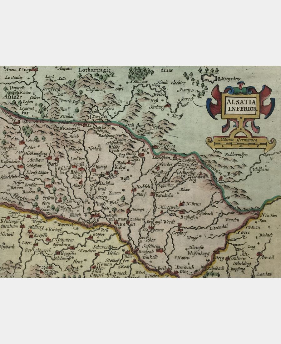 ALSATIA INFERIOR. 1610. Gravure sur cuivre. Coloris main. Dimension du feuillet : 186 x 292 mm Dimension au coup de planche : 135 x 175 mm.
