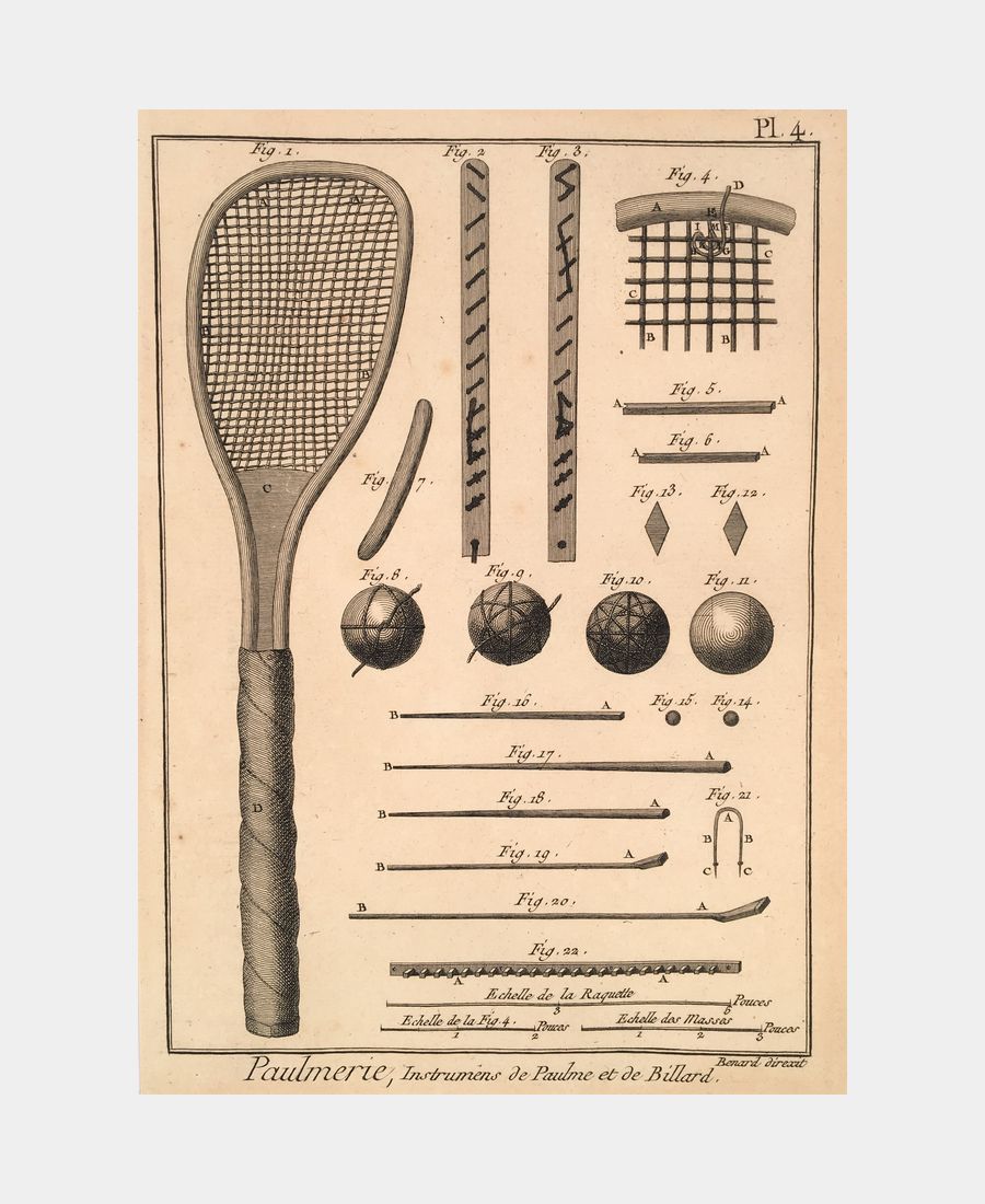 Paulmerie, Instrumens de Paulme et de Billard. Diderot et d’Alembert. Gravure sur cuivre. XVIIIe siècle.