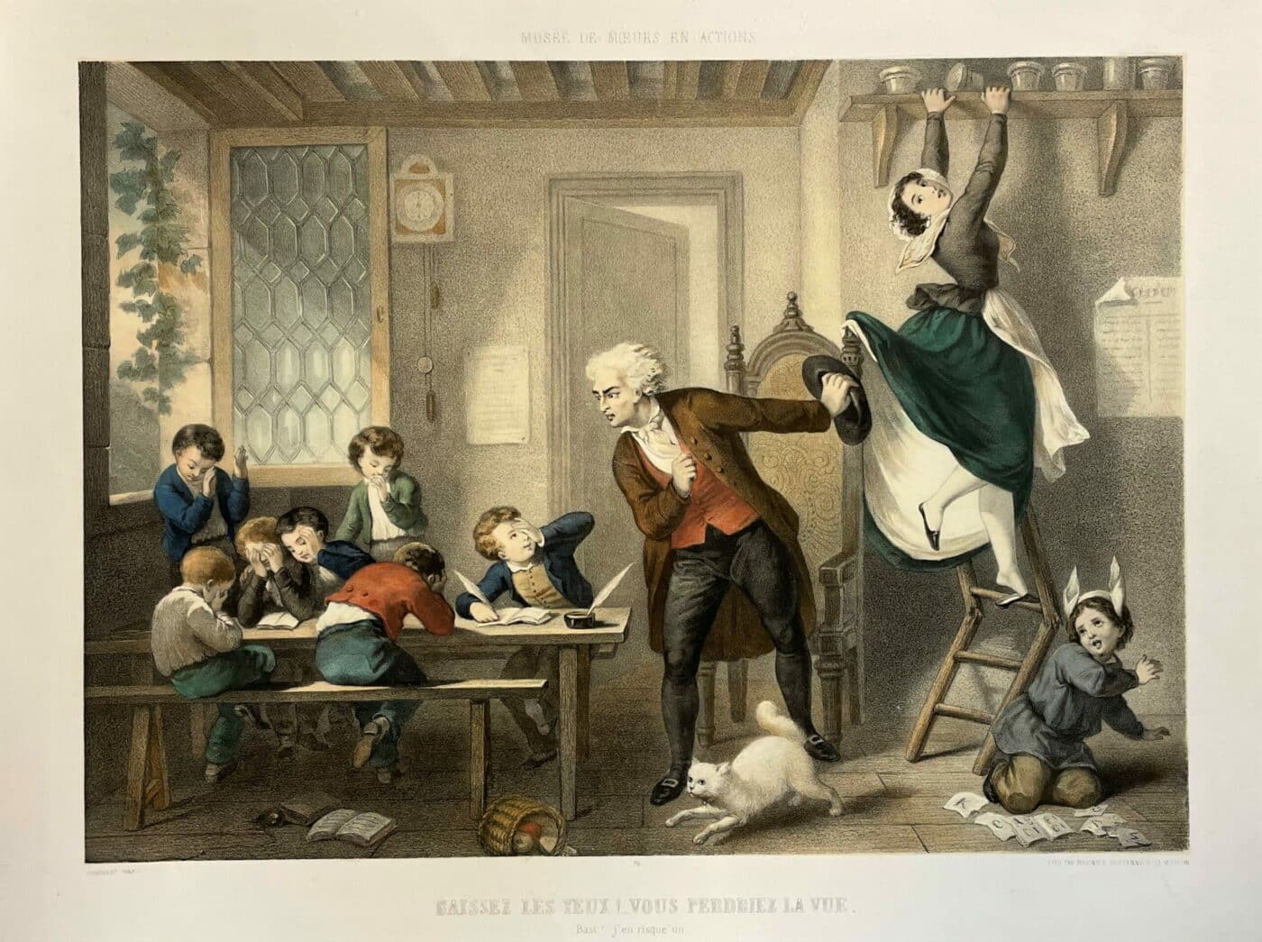 Baissez les yeux ! … Vous perdriez la vue. Bast ! J’en risque’un. Lithographie de Regnier, Bettanier et Morlon d’après Dubouloz. Vers 1850. Coloris main. Epreuve éditée par Bulla, Paris, imprimée chez Lemercier, Paris, issue de la série Musée de moeurs en action. Très légères épidermures marginales et plis discrets le long de la bordure supérieure sinon belle épreuve. Dimension du feuillet : 470 x 590 mm. Dimension du sujet : 364 x 500 mm.