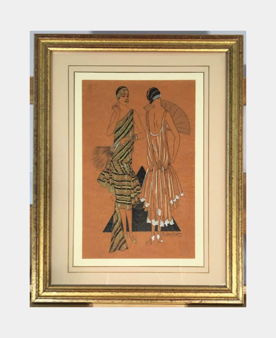 Elégantes à l’éventail. H. Uberto. Années 1920. Pochoir sur papier calque. Encadré. Dimension du cadre : 281 x 221 mm ; Dimension du sujet : 190 x 120 mm. Très bel exemplaire.