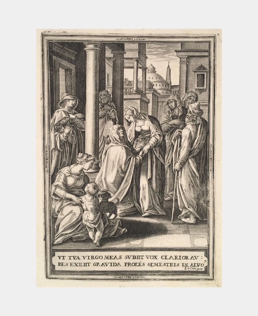 La Visitation. Gravé par Jean Leclerc d’après Jan van der Straet dit Stradanus (1523 – 1605). Burin. Fin du XVIe siècle. Dimension du feuillet : 254 x 198 mm. Dimension au coup de planche : 174 x 138 mm. Encrage moins marqué en bordure droite sur 2 cm.