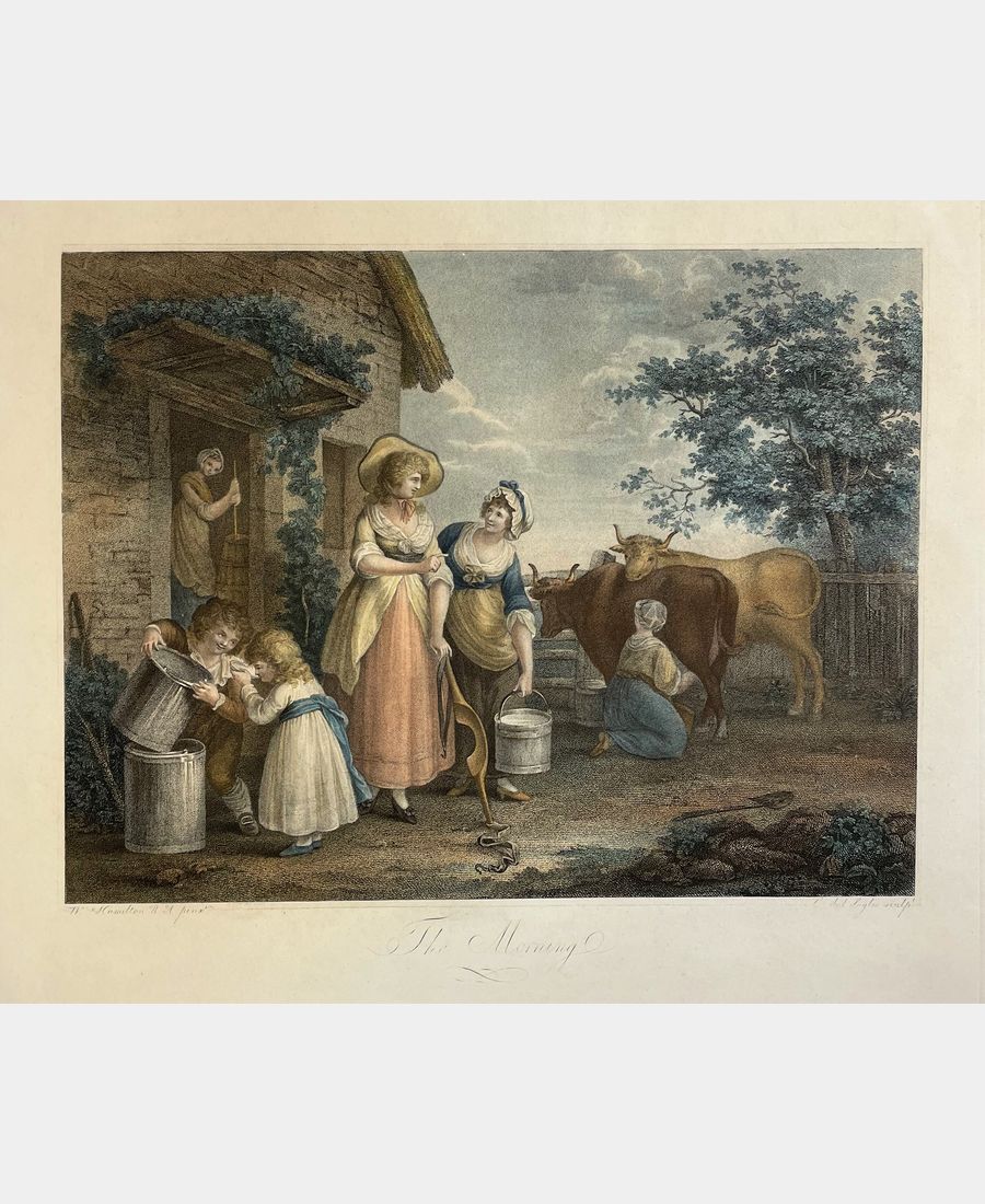 The Morning. Gravure de L. Dal Soglio d’après William Hamilton (1751 – 1801). Gravure au pointillé, coloris main d’époque. XIXe siècle. Infimes épidermures. Dimension du feuillet : 398 x 463 mm. Dimension au coup de planche : 355 x 425 mm.