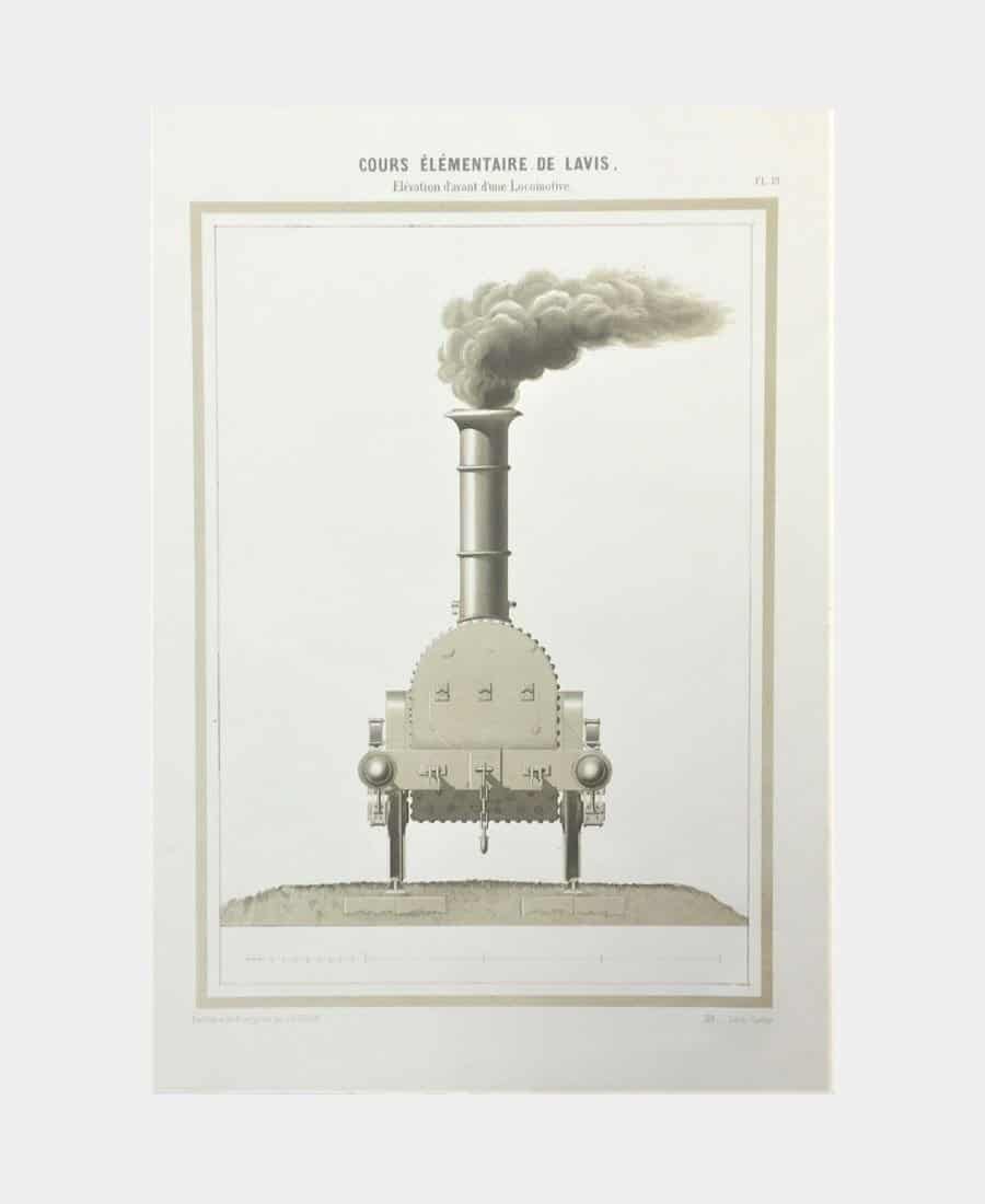 Elévation d’avant d’une Locomotive. Lavis lithographique de Jean-Baptiste Tripon (Né en 1801 à Limoges). 1848. Chez Cathier à Paris. Dimension du feuillet : 378 x 261 mm. Dimension du sujet : 280 x 196 mm.