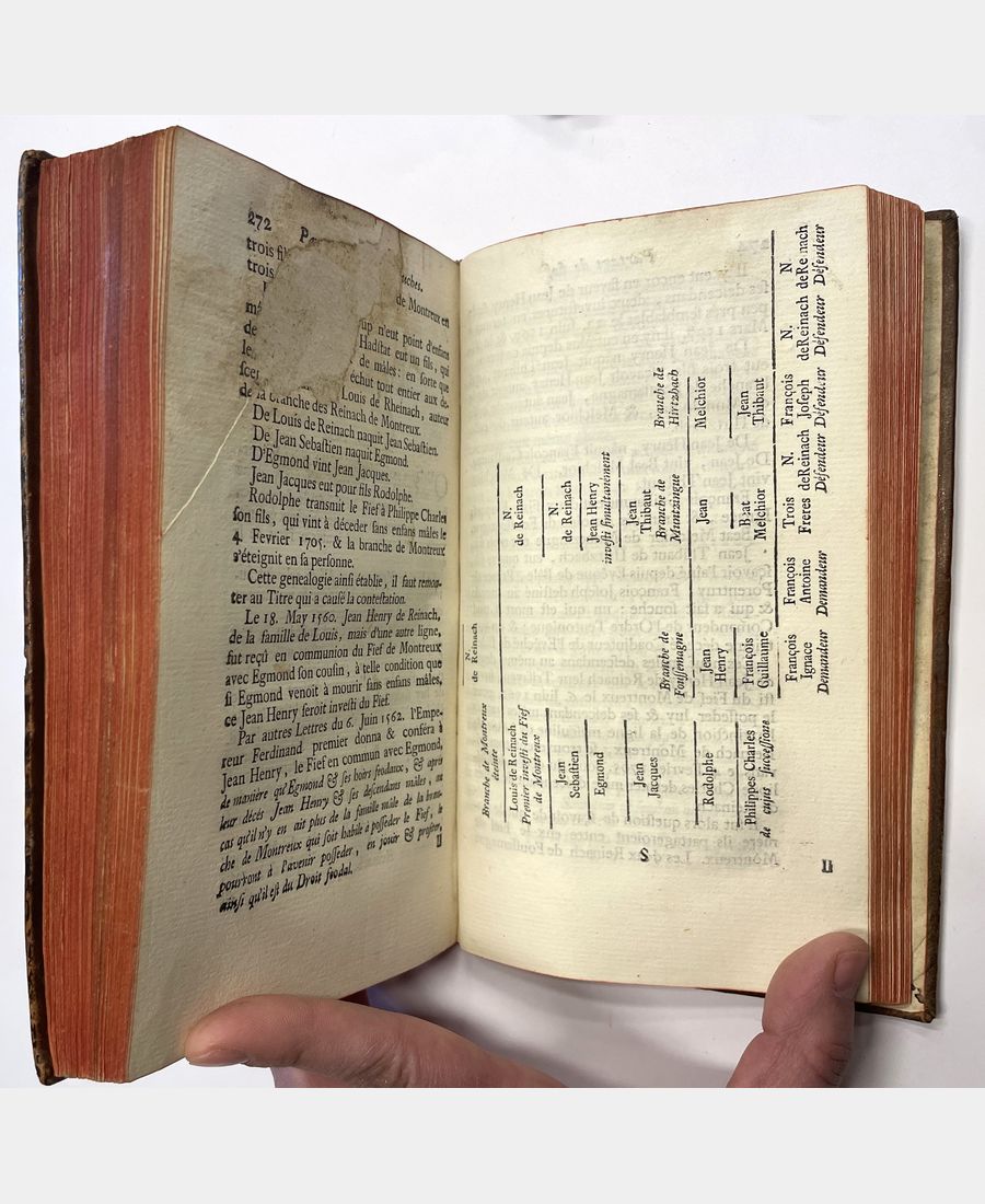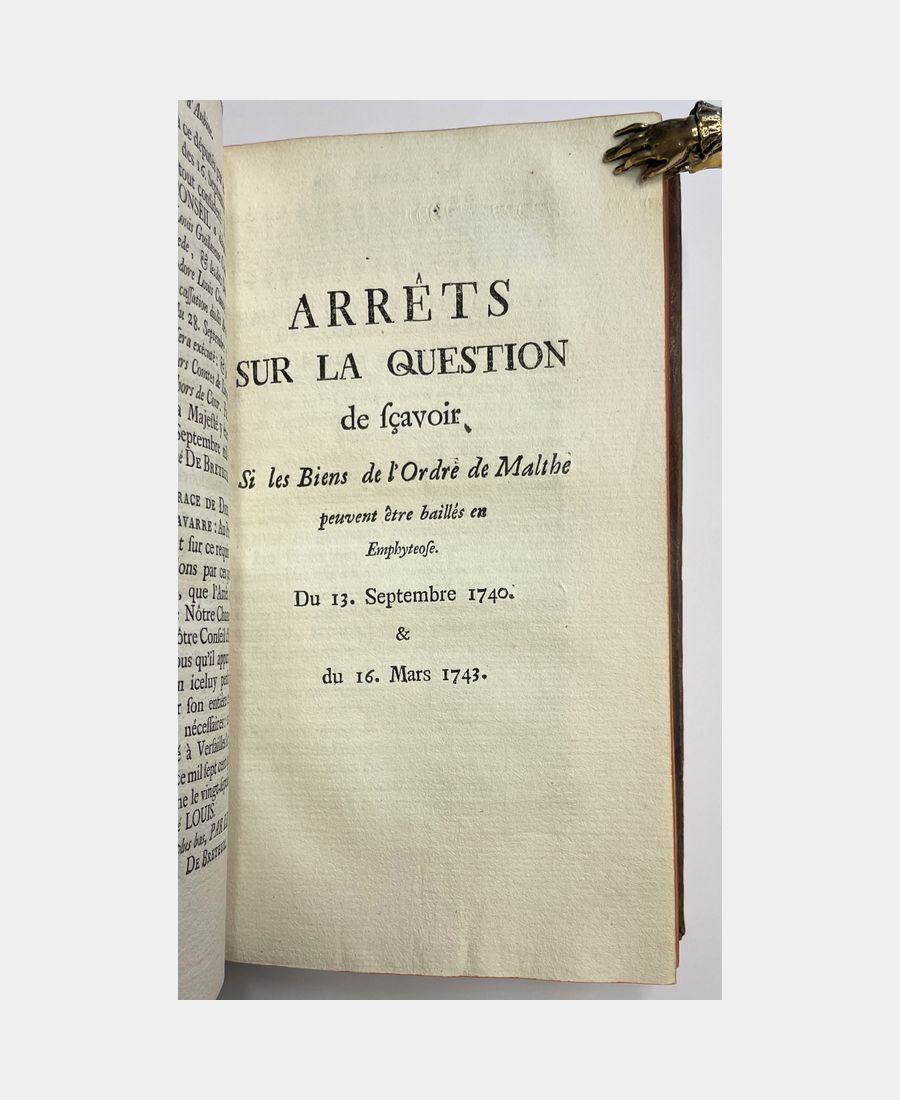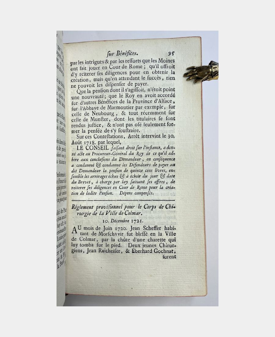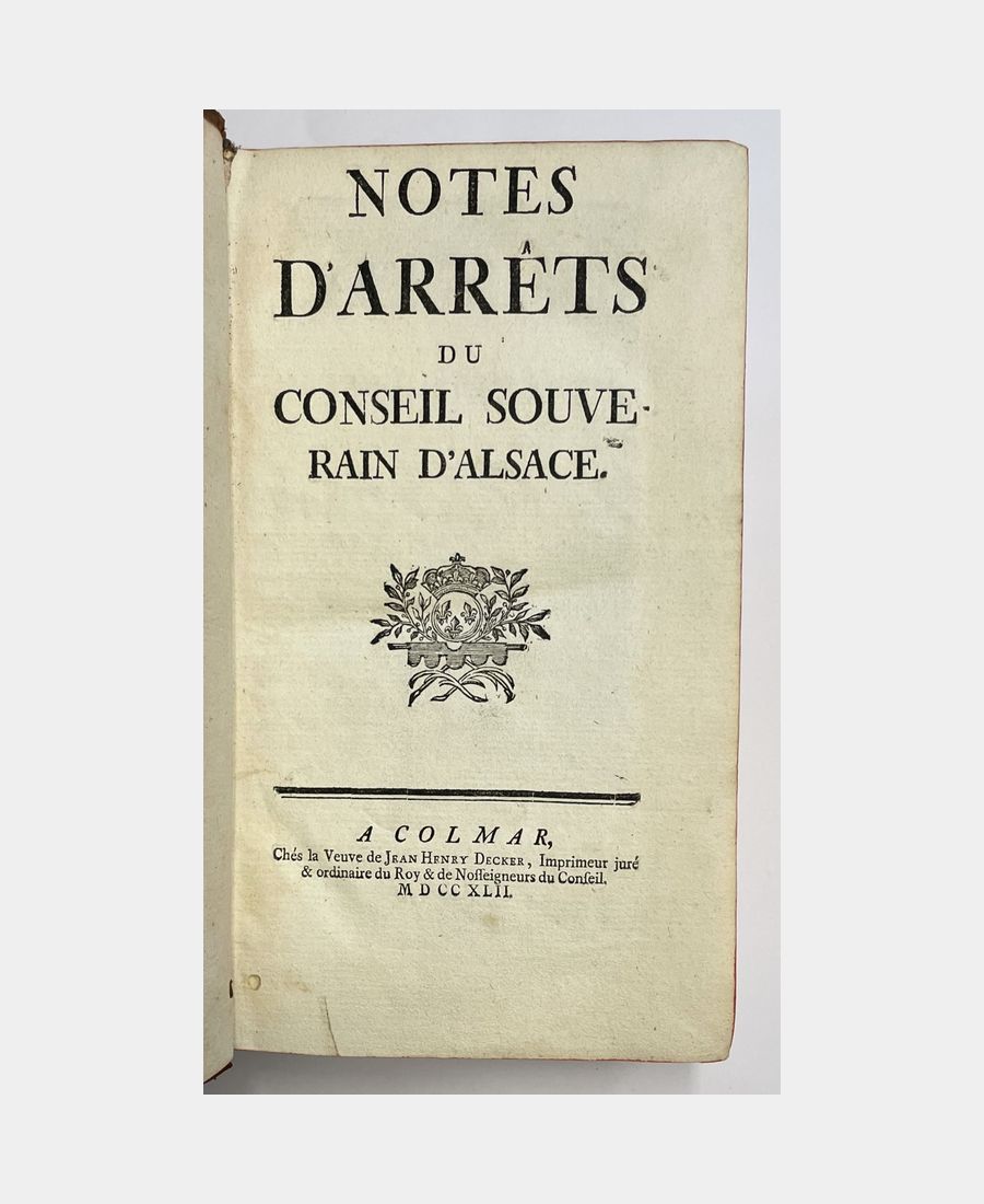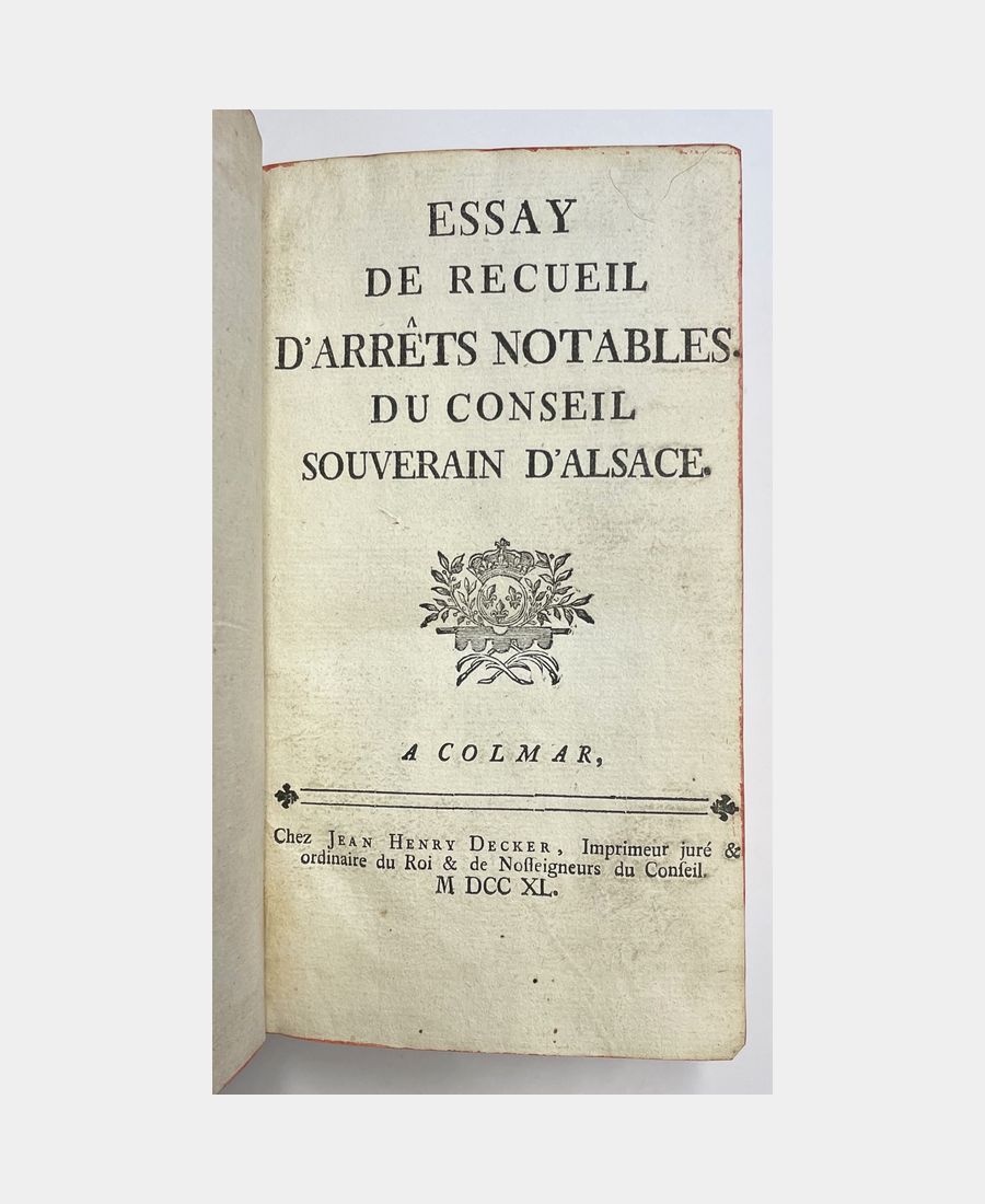 Colmar, Chez Jean Henry Decker puis Chez la Veuve de Jean Henry Decker, 1740 – 1743. Trois volumes in-12 de 473+7 pp.n.ch.+416+14pp.n.ch.+360+7pp.n.ch. Plein veau marbré d’époque, dos à nerfs, pièces de titre rouge et de tomaison verte. Coiffes restaurées. Quelques feuillets jaunis, ancienne restauration p. 271-272 du 3e tome avec manque de texte sur 7 lignes sinon bel exemplaire. Nicolas de Corberon (1689 – 1764) occupa, à la suite de son père, la charge de Premier Président au Conseil Souverain d’Alsace, chambre d’enregistrement des édits royaux et tribunal suprême de la province. «Source essentielle, non seulement de l’histoire de l’Alsace, mais aussi de l’histoire économique et sociale de cette province» (Saffroy). Contient des arrêts sur l’emphytéose de biens de l’Ordre de Malte.