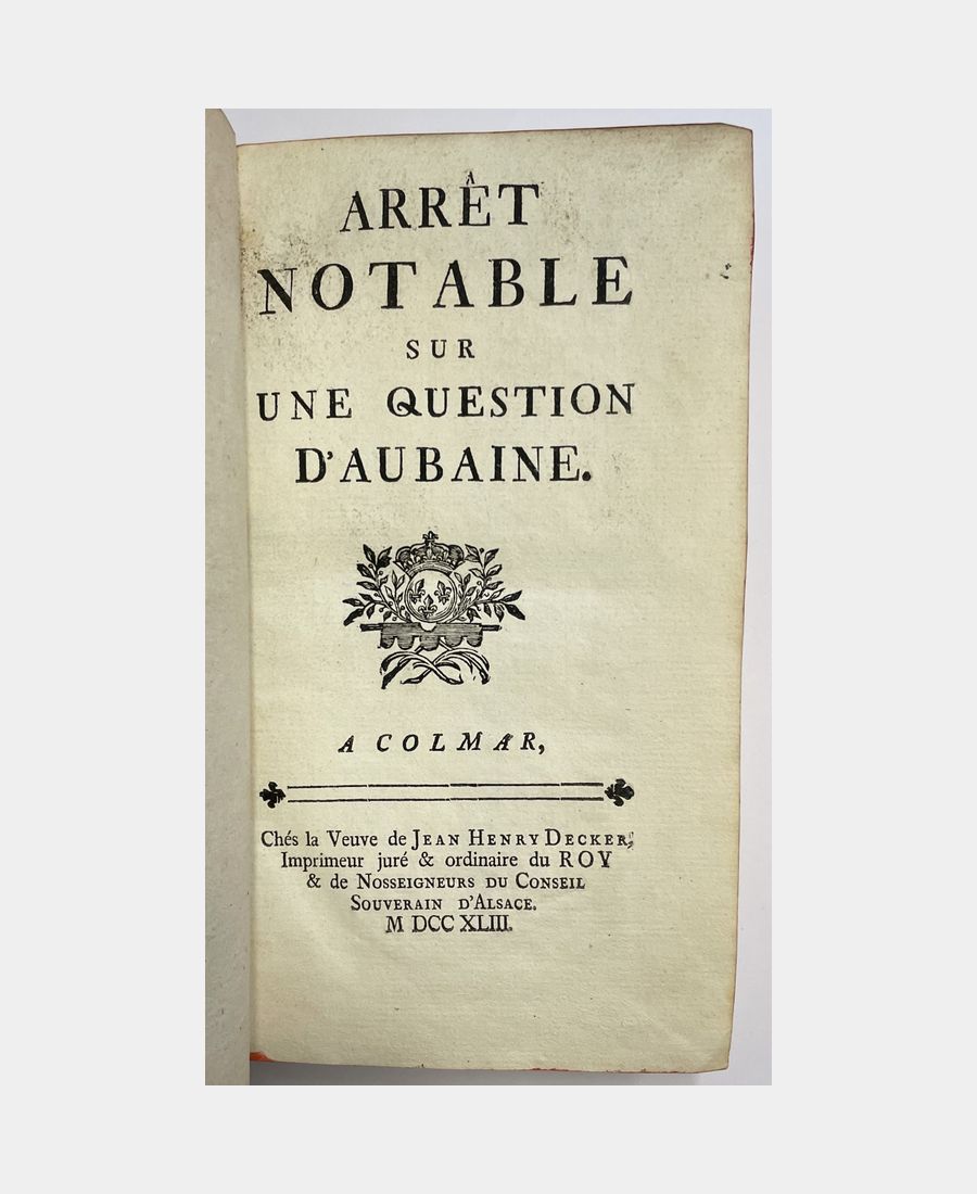 Essay de recueil d’arrêts notables du Conseil souverain d’Alsace. Note d’arrêts notables du Conseil souverain d’Alsace. Arrêt notable sur une question d’aubaine. CORBERON (Nicolas de). 1740 – 1743.