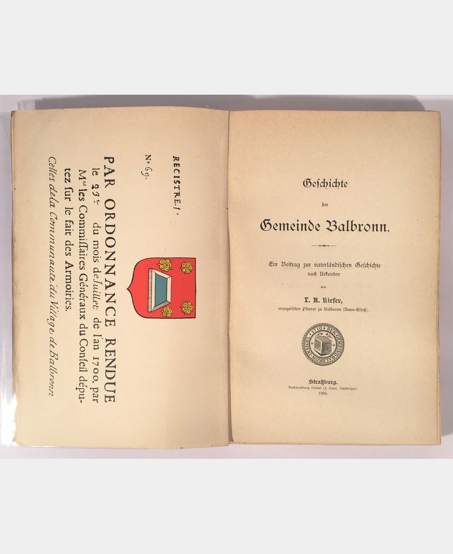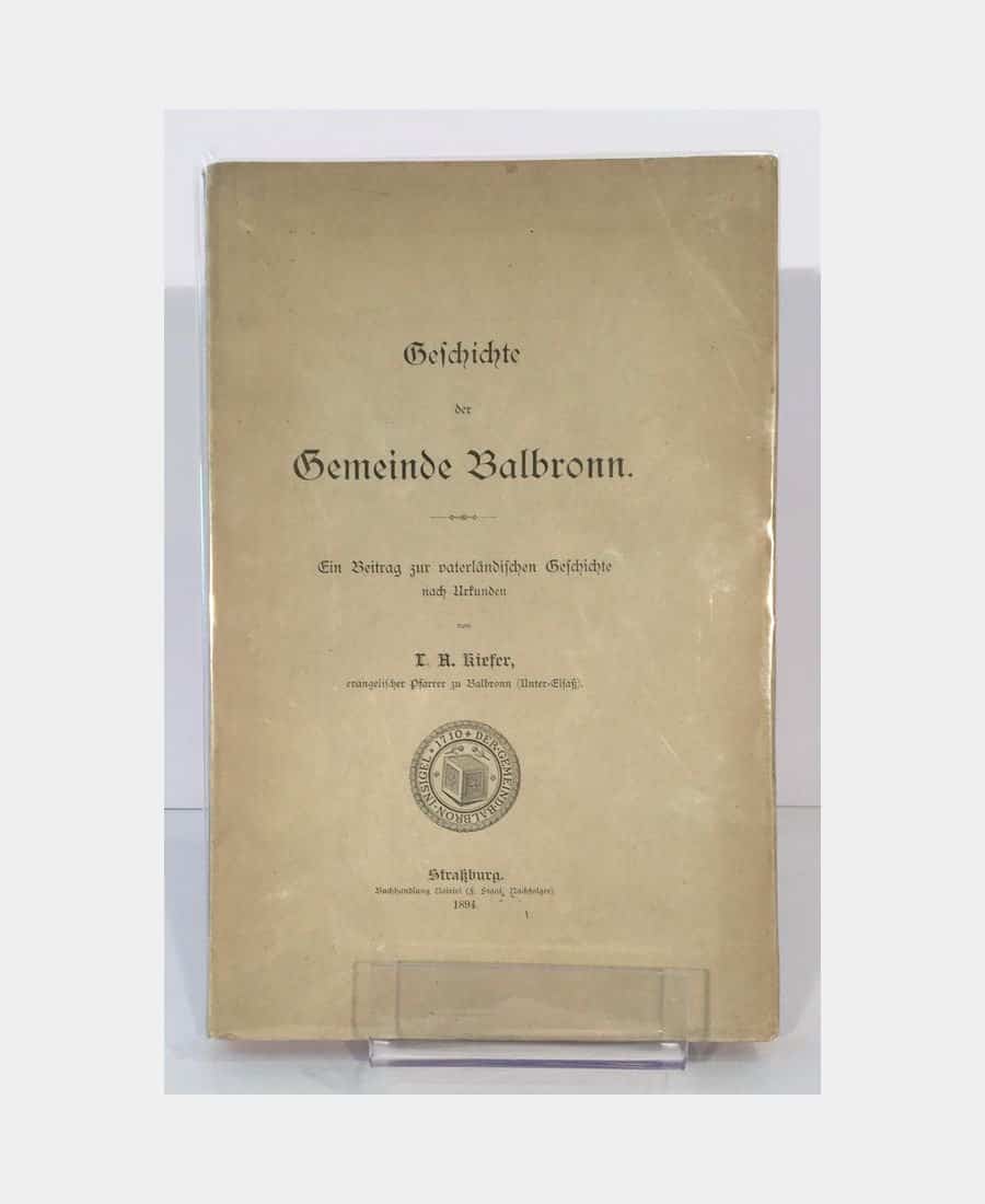 Strasbourg, Buchhandlung Noiriel (F. Staat, Nachfolger), 1894 ; in-8 de IX et 360 pages, broché, couverture imprimée. Pliures sur le plat supérieur, légères marques sur le plat inférieur. Frontispice présentant les armoiries de Balbronn. Répertoire des personnalités nées à Balbronn in fine.