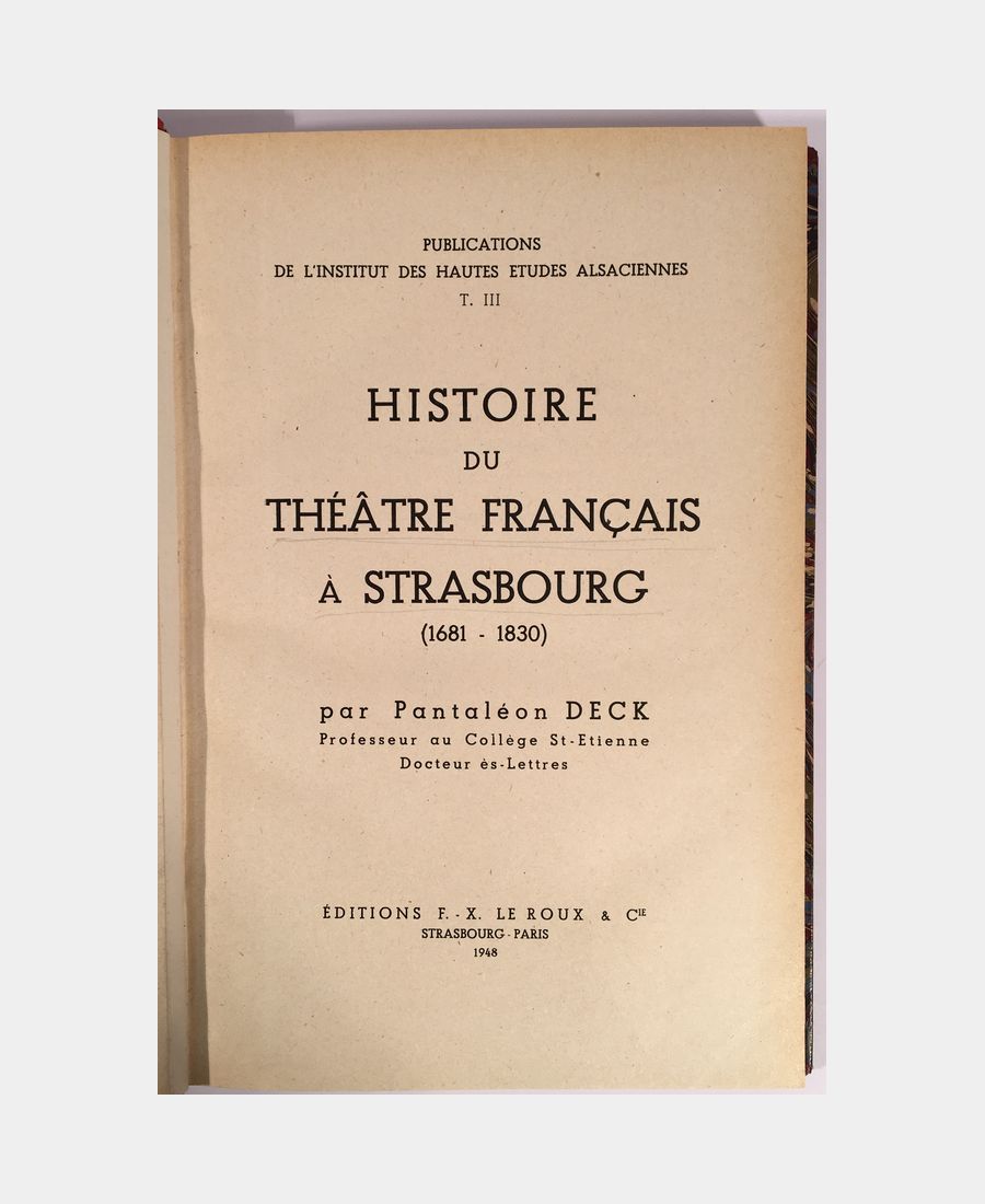 Editions F.-X. Le Roux, Strasbourg – Paris, 1948 : in-8 de 317 pages. Demi-toile rouge à la Bradel, dos lisse avec filets, pièce de titre. Une publication de l’Institut des hautes études alsaciennes.