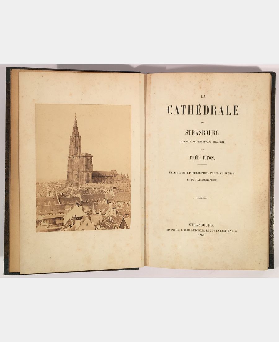 Strasbourg, Ed. Piton, Libraire-éditeur, 1861 ; in-8 de 119 pages. Demi-toile à coins verts bouteille, dos titré doré, plats à motif floral en relief. Exemplaire bien complet des 3 photographies de Charles Winter et des 7 planches lithographiées d’après les dessins de l’auteur et de Silbermann. Rousseurs éparses comme souvent sur cet ouvrage, tampon ancien. Bon exemplaire dans une jolie reliure.