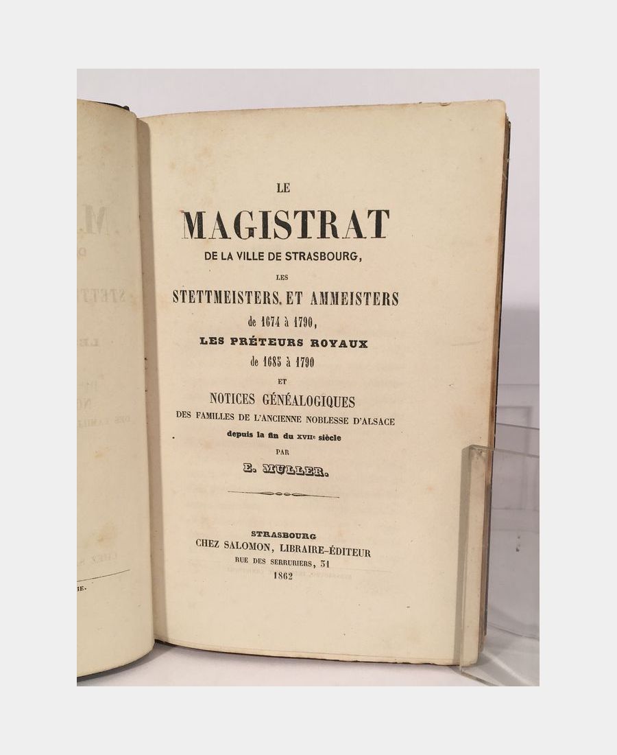 Strasbourg, Salomon, 1862. In-12 (185x125mm), 270 pp. Demi-chagrin brun, dos à nerfs titré. Rousseurs marginales. Muller poursuit la liste des stettmeisters et ammeisters établie par Bernegger dans sa chronique La seconde partie est consacrée à l’histoire de la noblesse alsacienne. Ex-libris du Dr Japoprawski par Henri Solveen. Cachet du relieur. Bon exemplaire.