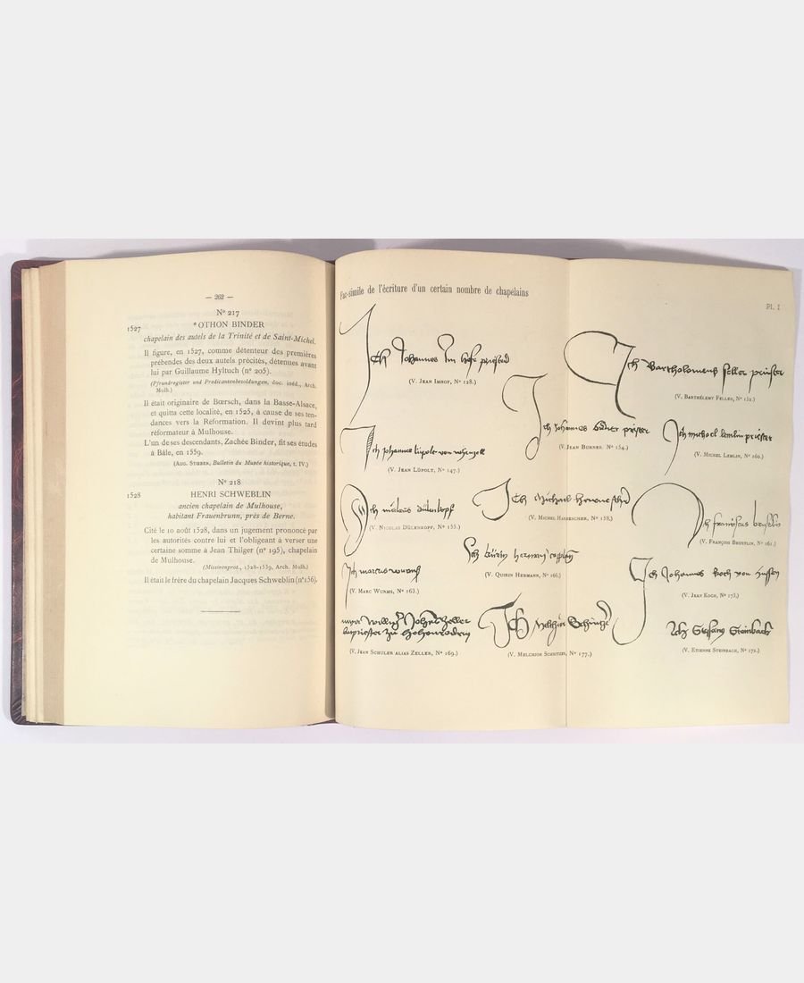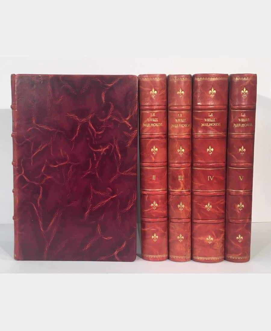 Mulhouse, Imprimerie Veuve Bader & Cie, 1895 – 1914 ; 5 volumes in-4 de VIII et 401 pp., XV et 550 pp., XIV et 428 pp., XL et 624 pp., X et 397 pp. Plein cuir bordeaux raciné, dos à nerfs, titre, tomaison, filets et fleur de lys dorés. Complet des 5 volumes et de leurs hors-textes publiés de 1895 à 1914 présentant des documents d’archives en français et en allemand. Dos légèrement insolés sinon bon exemplaire.