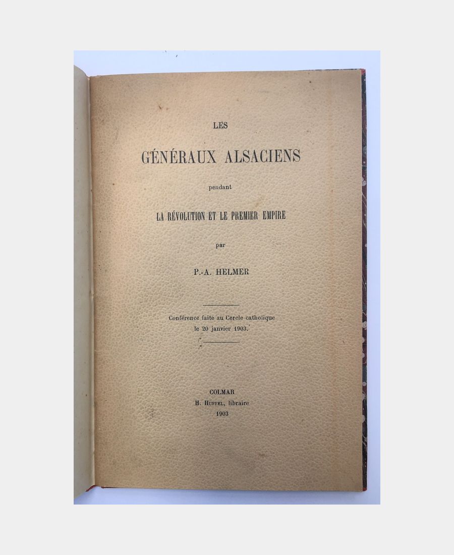 Colmar, H. Huffel, 1903 ; in-8 de 30 pages. Demi-toile rouge à la Bradel titrée sur le plat supérieur, dos lisse. Couvertures originales conservées. Conférence faite au Cercle catholique le 20 janvier 1903, à la mémoire de Jacques Voilin, qui défendit Huningue sous les ordres de Barbanègre.