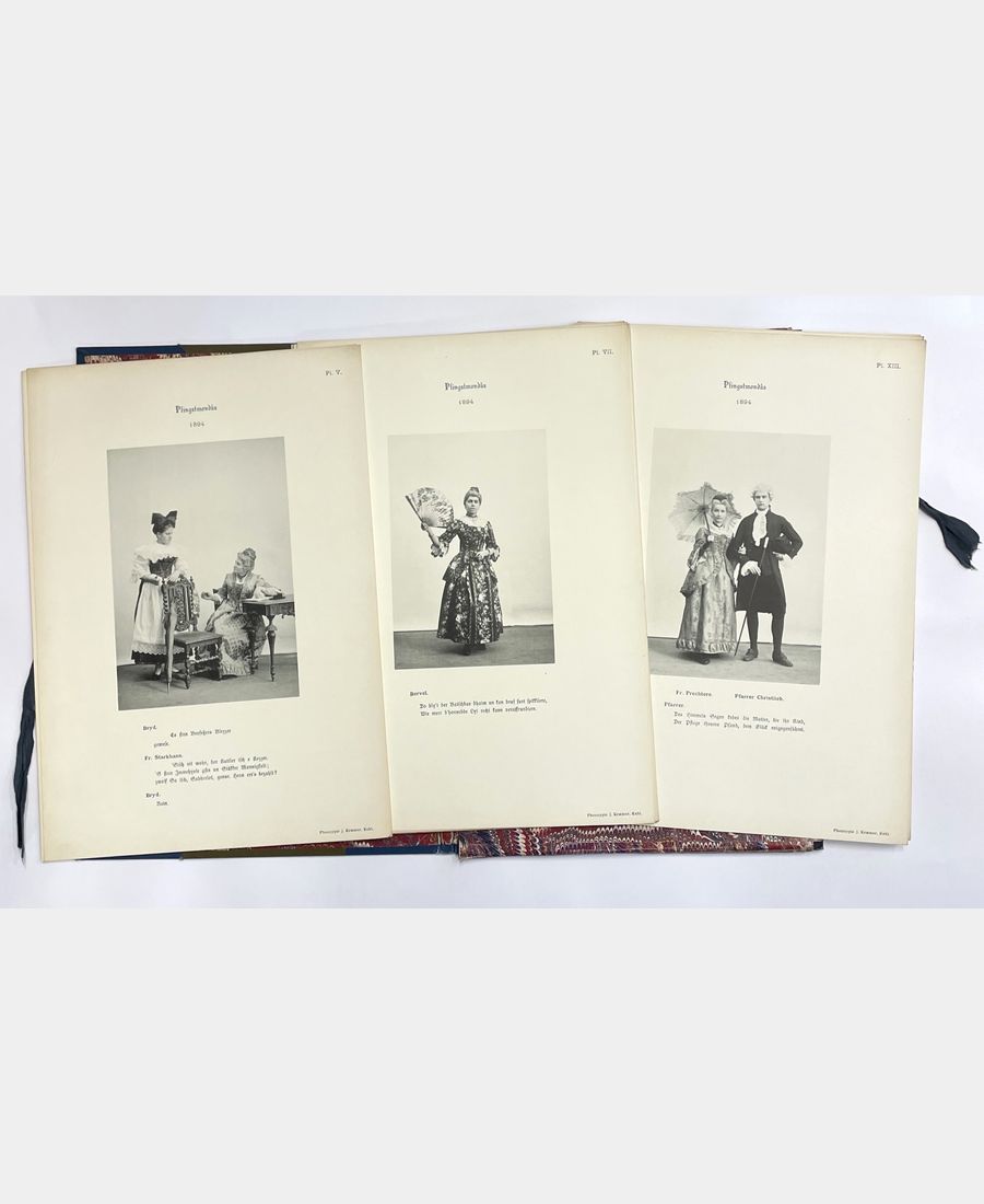 Strasbourg, 1894 ; in-folio, titre et 17 planches. Portefeuille d’éditeur à lacets, dos et coins en toile bleu, plat supérieur imprimé. Cartonnage usagé, petites déchirures aux rabats en papier marbré. Bien complet du titre reprenant le programme illustré par Krafft et des 17 planches en phototypies imprimées par J. Kraemer à Kehl, représentant les comédiens en costumes lors de la représentation théâtrale en janvier 1894 de cette célèbre pièce d’Arnold.