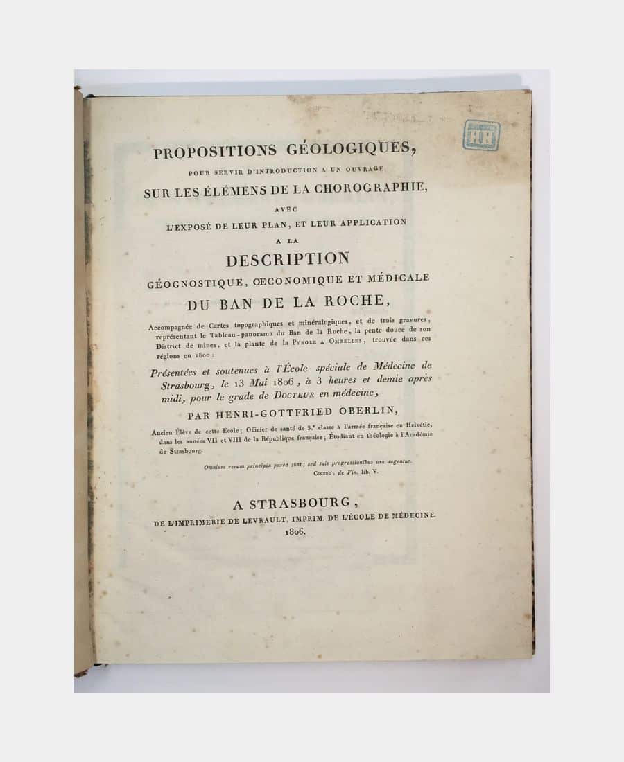 Propositions géologiques (…) a la description géognostique, oeconomique et médicale du Ban de la Roche. Oberlin (Henri-Gottfried). 1806.