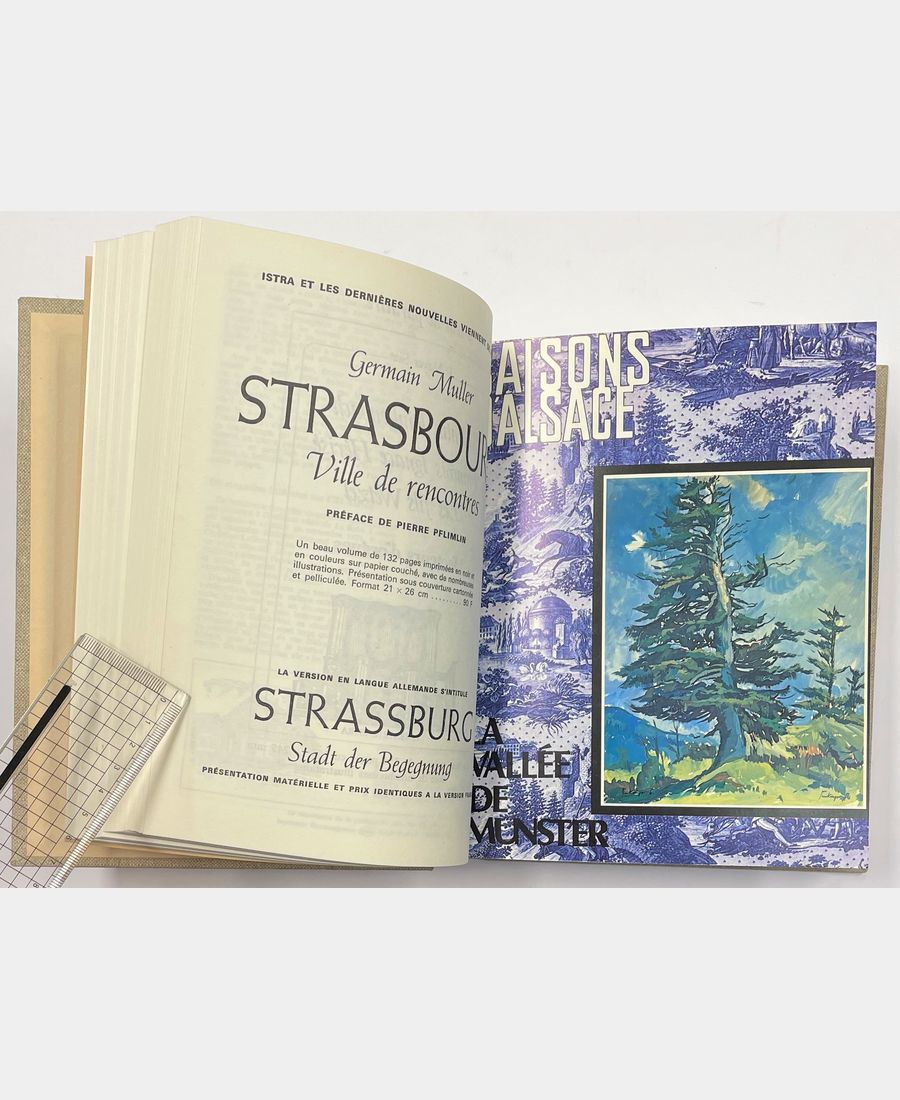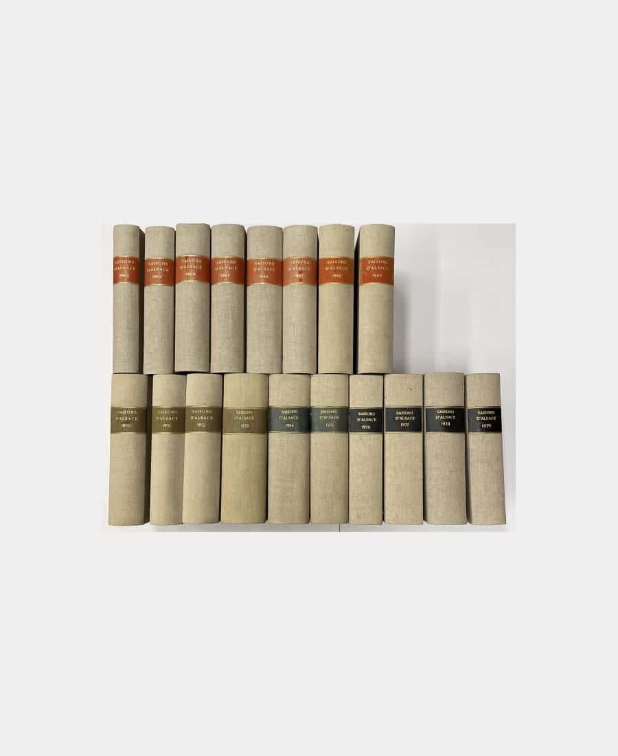 Strasbourg, Istra, 1962 – 1979 ; ensemble de 18 volumes regroupant une année complète chacun, soit 4 numéros par volume, 72 numéros. Pleine toile beige, pièce de titre au dos. La revue « Les Saisons d’Alsace » est une revue trimestrielle illustrée abordant des sujets très variés sur l’Alsace ; histoire, art, gastronomie, sciences… publiée depuis 1948. Une première série a été éditée de 1948 à 1954, une seconde à partir de 1962. Cet ensemble de 18 volumes correspondant aux dix-huit premières années de la deuxième série, du numéro 1 au numéro 72. Chaque volume correspond à une année complète soit 4 numéros. Comprend notamment Le Musée de l’impression sur étoffes de Mulhouse ; Napoléon et l’Alsace ; La Moyenne Alsace ; Albert Schweitzer ; Hommage à Jean-Hans Arp ; Brumath ; Les plaisirs de l’Alsace à table ; Le château de la Robertsau ; Gustave Stoskopf ; Pasteur à Strasbourg ; L’archéologie en Alsace ; Le Bel, Pechelbronn ; Albert et Adolphe Matthis ; les Juifs d’Alsace ; La nazification en Alsace ; Les Tsiganes en Alsace… Bel ensemble bien complet des numéros 1 à 72.