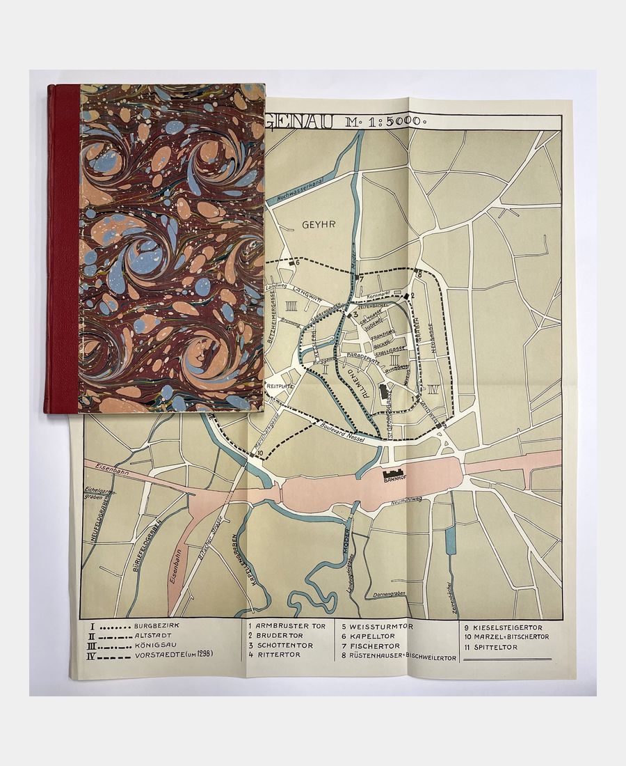 Haguenau, Imprimerie de Haguenau, 1921 ; grand in-8 de V + 133 pp.. Demi-toile rouge à la Bradel, dos lisse avec auteur et titre dorés. Tampon d’appartenance sur la page de titre. Exemplaire bien complet du plan de la ville in fine.