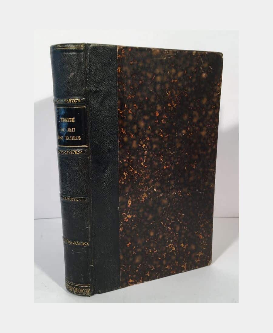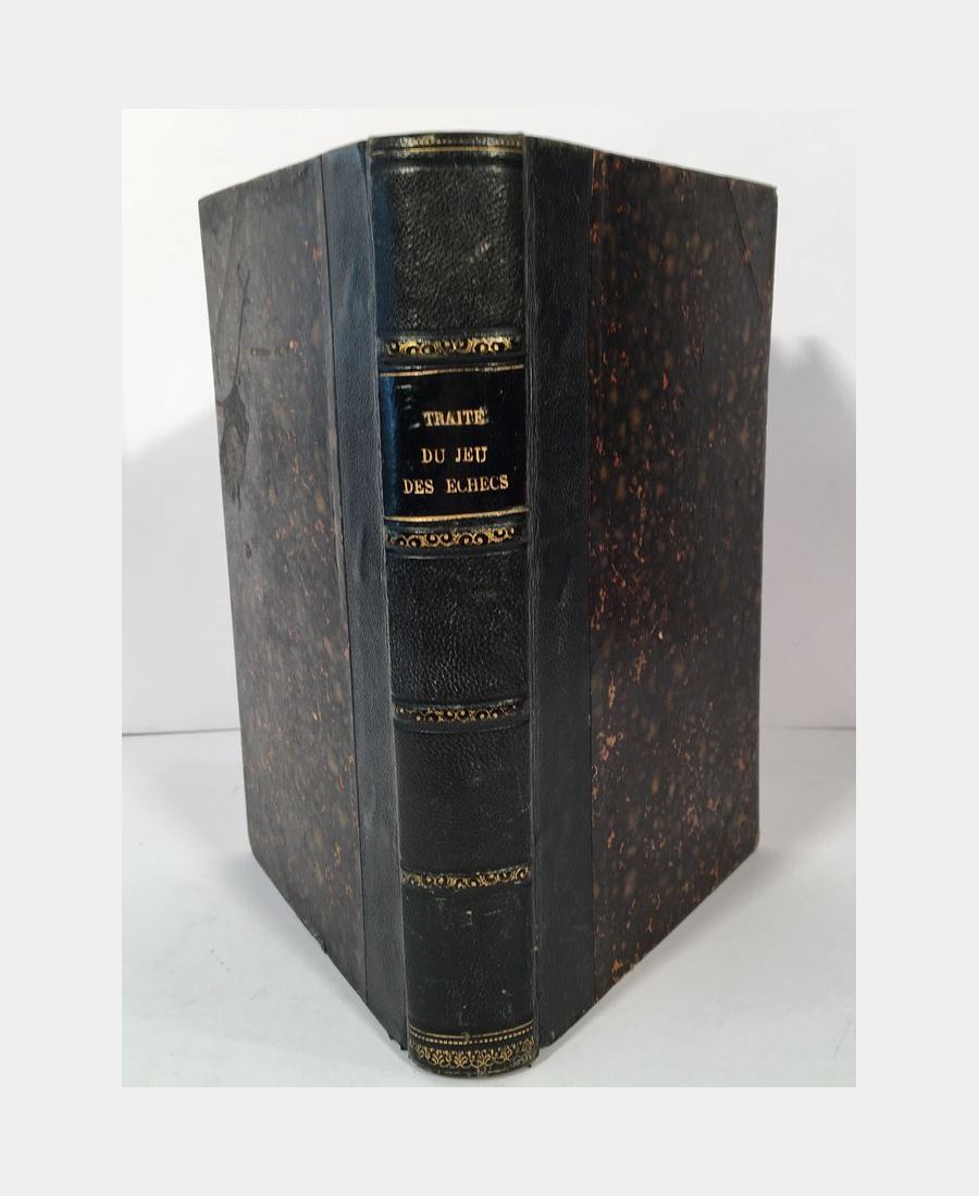 Paris, Allouard, 1863 ; in-8 (217x145mm), 507 pp., frontispice. Demi-chagrin noir, dos à nerfs titré, pièce de titre noire. Deuxième édition de cet ouvrage dédié aux échecs et qui « Se vend au Café de la Régence », café parisien réputé qui était fréquentait par de nombreux joueurs d’échecs qui y avaient leurs habitudes : Deschapelles, Philidor, Alfred de Musset… Tache sur le plat inférieur, coins légèrement émoussés, pliure à l’angle supérieure des deux premières pages.