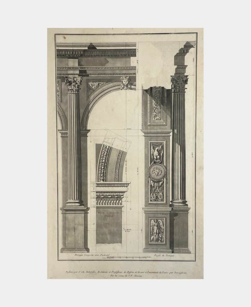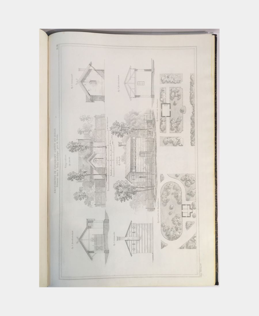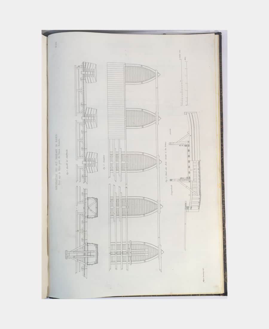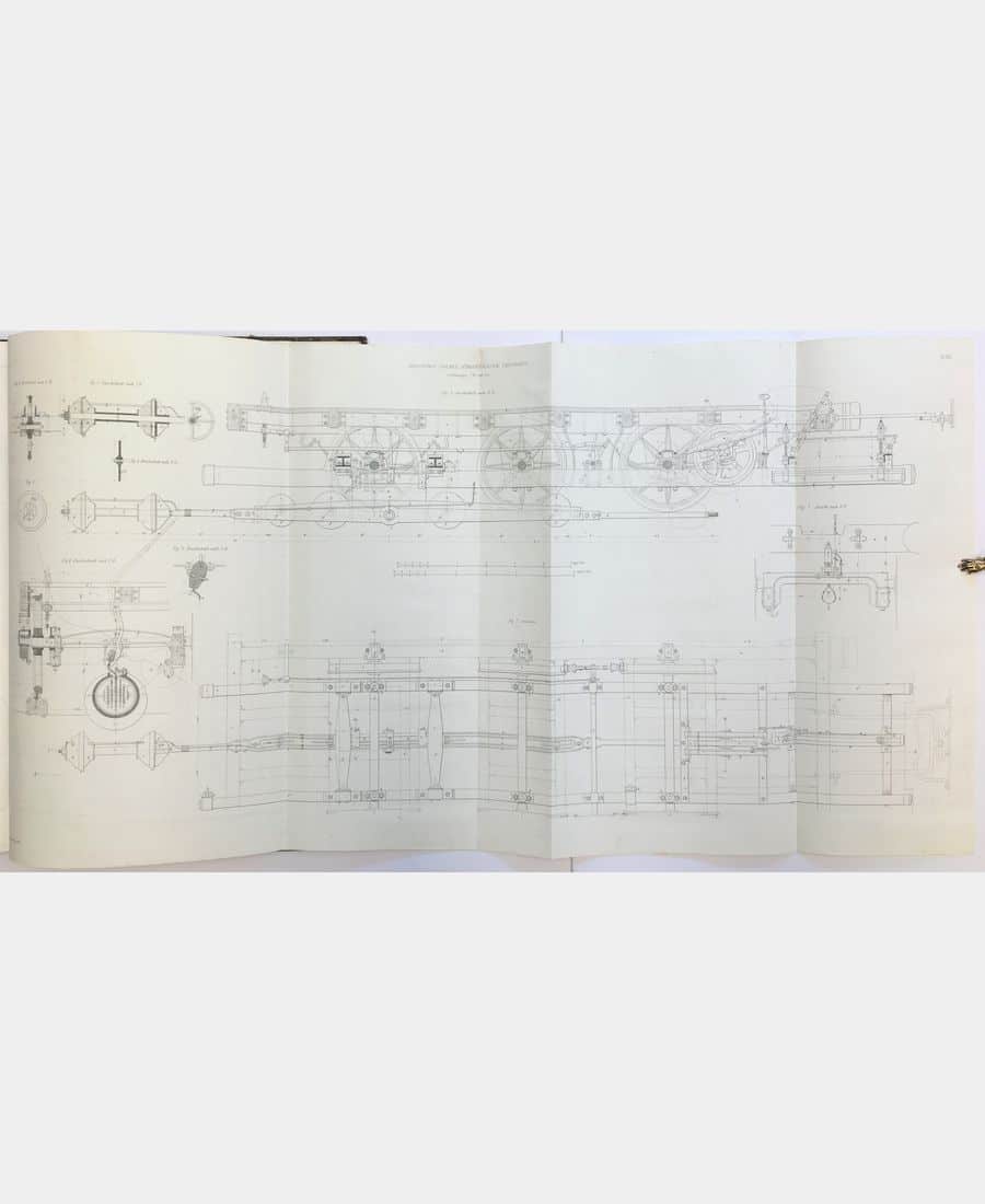 Wien, Förster’s artistische Anstalt, 1847 à 1851. 5 grands in-folio d’environ soixante-dix planches à l’eau-forte chacun. Demi-veau brun à coins, dos lisse à faux nerfs et filets dorés, pièce de titre. Mouillures sur 2 planches des deux premiers tomes, très légères rousseurs et traces de manipulations. Chaque volume est bien complet de ses planches. Année 1847 : 69 planches dont un grand plan dépliant de Vienne, 7 pl. de bâtiments dans le Jardin zoologique de Berlin, 6 pl. sur le pont sur le Rhin près de Vieux-Brisach. Année 1848 : 80 planches dont 2 pl. concernant le pont sur l’Ill vers Sundhoffen. Année 1849 : 73 planches dont 8 pl. de façades de palais et d’édifices vénitiens, 7 pl. sur la ligne ferrovière de Paris à Saint-Germain, 6 pl. sur la gare de Camden. Année 1850 : 71 planches dont 3 pl. sur la gare La Chapelle, Paris. Année 1851 : n°374 à 437 : 63 planches dont 5 sur les chemins de fer et 19 sur les gares. Bel ensemble présentant des vues, des plans d’élévation de bâtiments et d’ingénieries construits en Europe. Certaines planches sont dépliantes, l’ensemble est d’une grande finesse.
